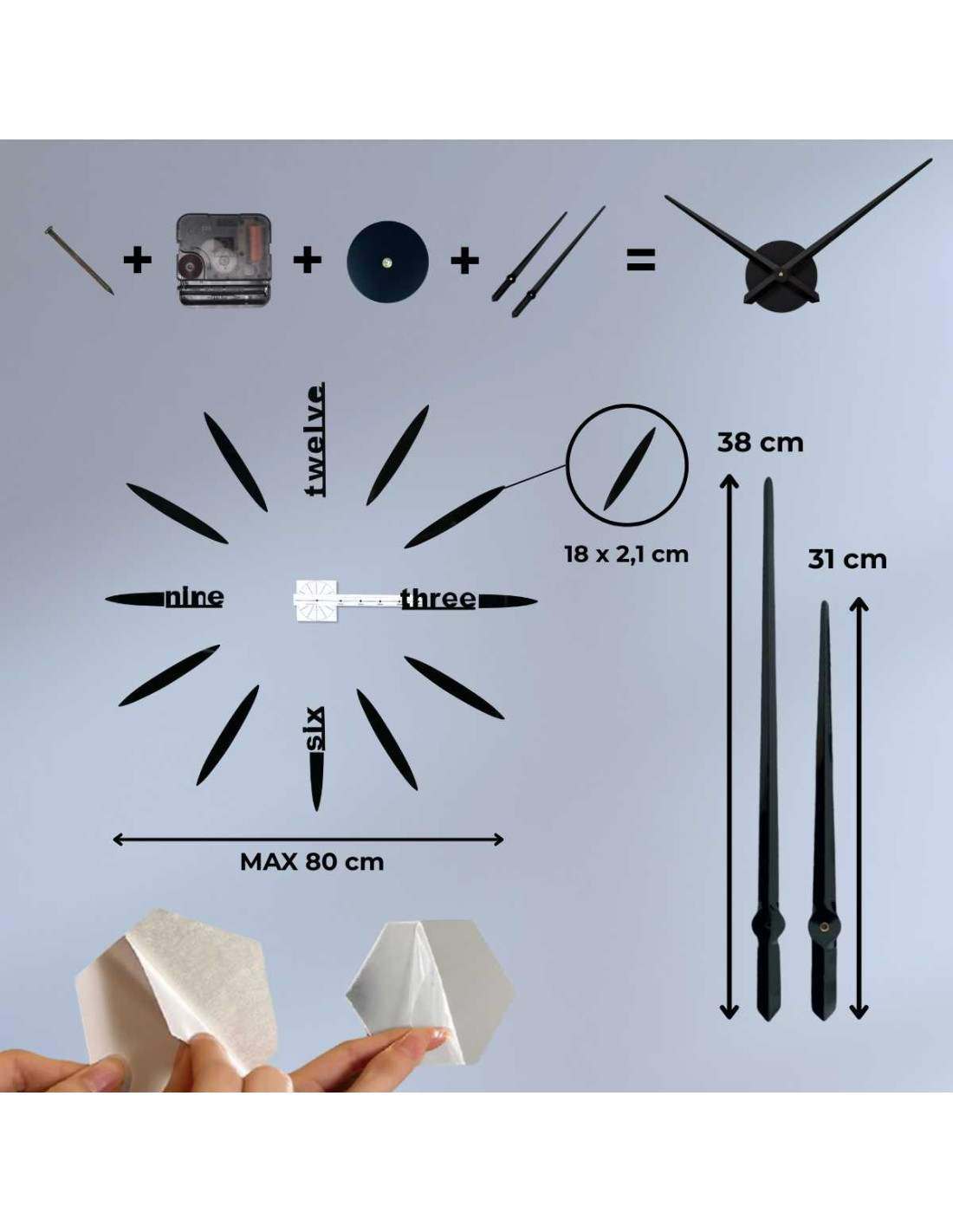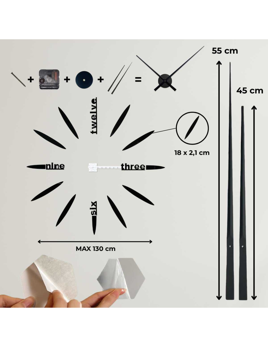 Discover a stylish wall clock with an adjustable diameter of up to 130 cm, which will stand out as a striking element in the living room, bedroom, office or entrance hall.