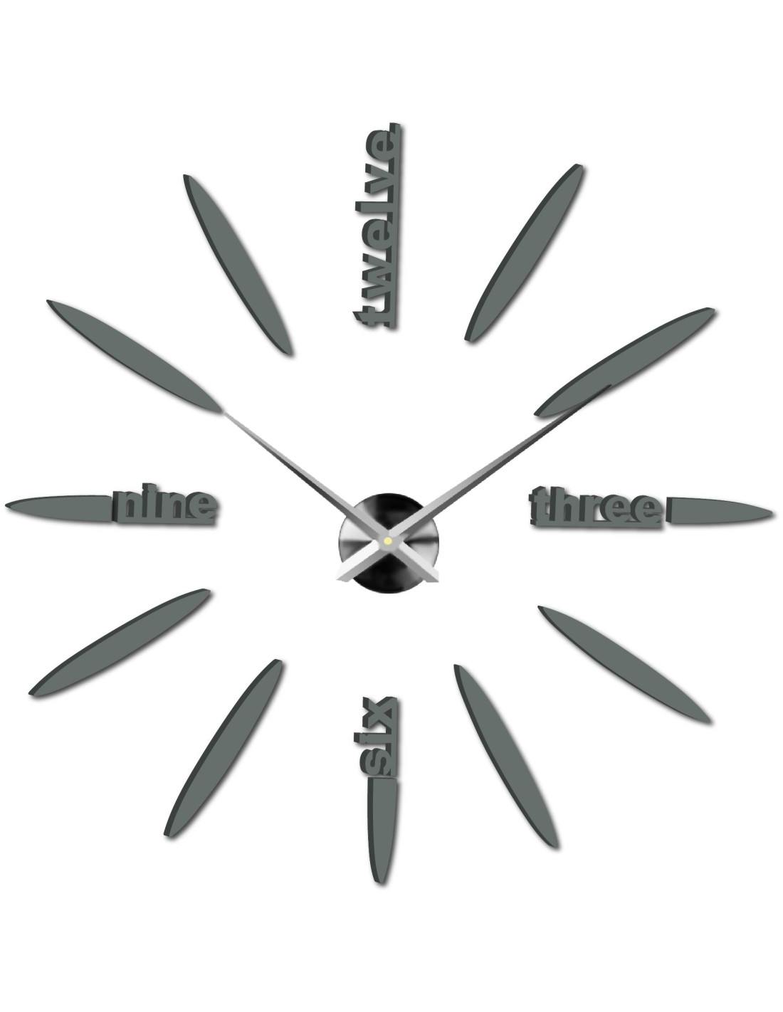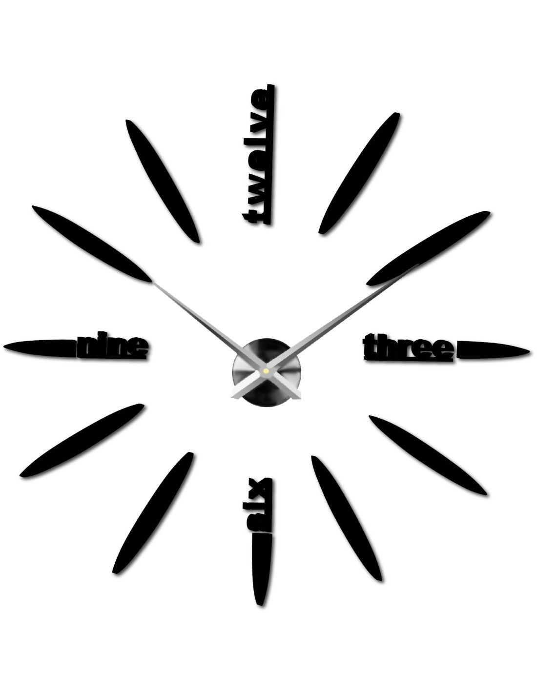 Modern 3D wall clock with inscriptions instead of numbers and a minimalist design.