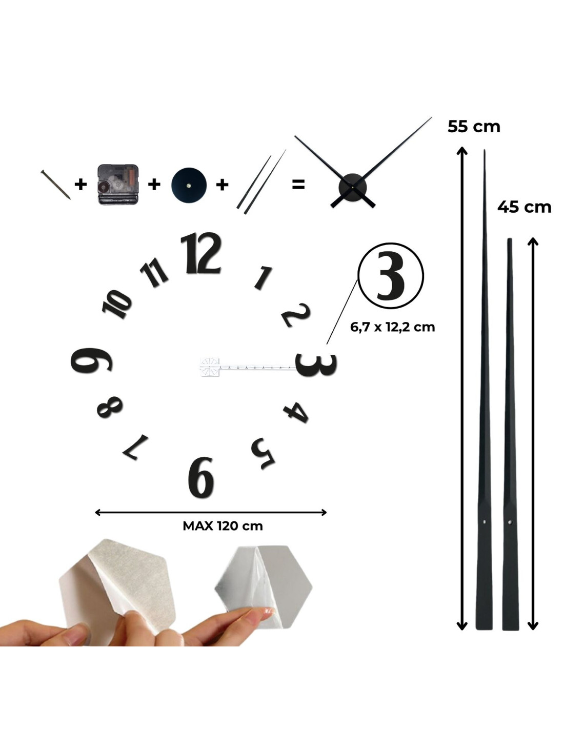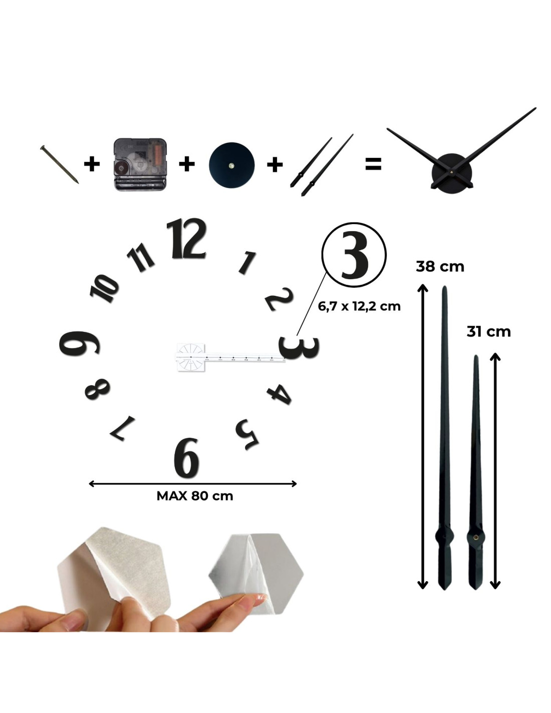- We use the same hands for all clock sizes (30 cm, 40 cm, 50 cm). The size does not change, only the diameter of the clock changes.