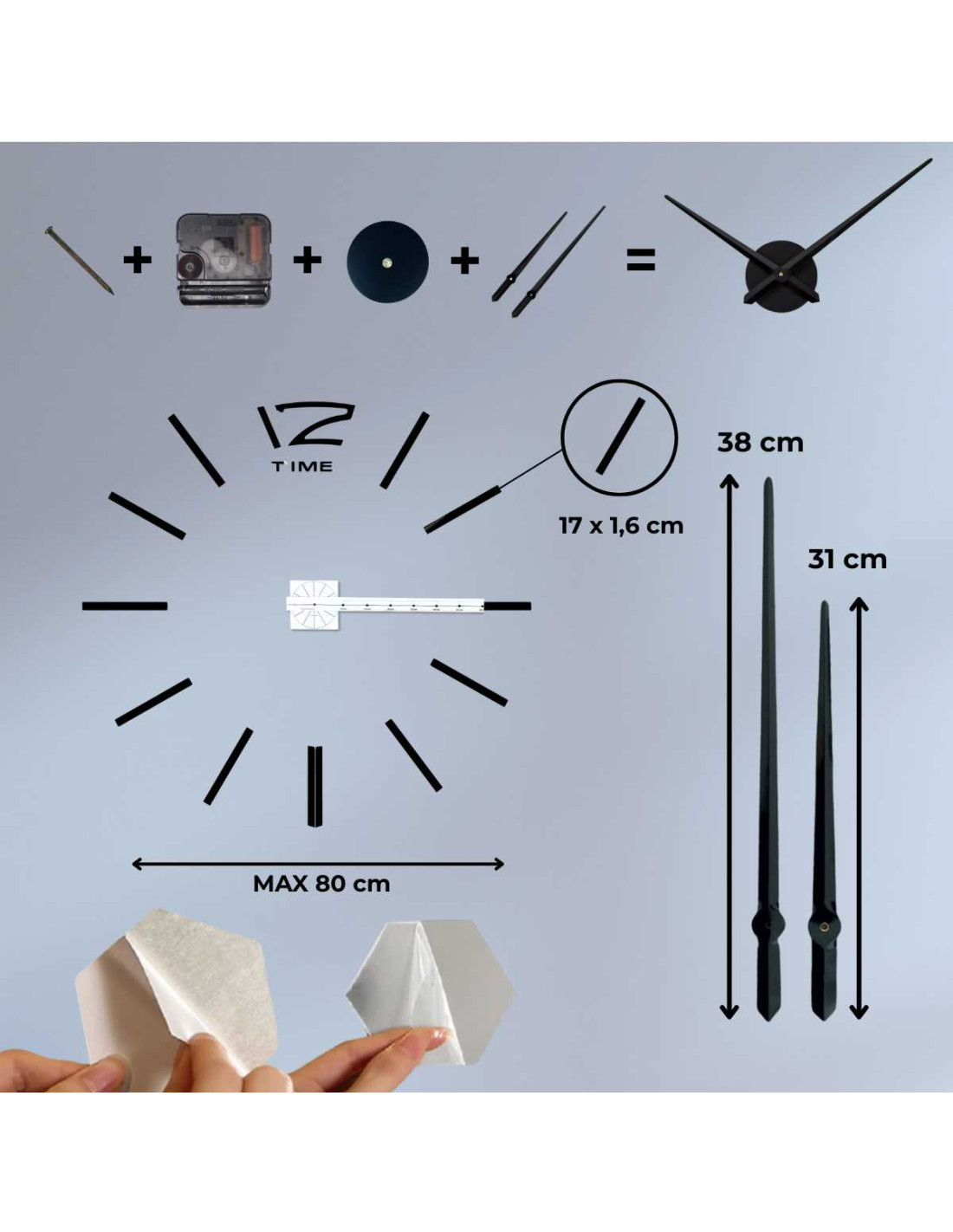 - hour: 31 cm, Minute: 39 cm or Hour: 45 cm, Minute: 53 cm