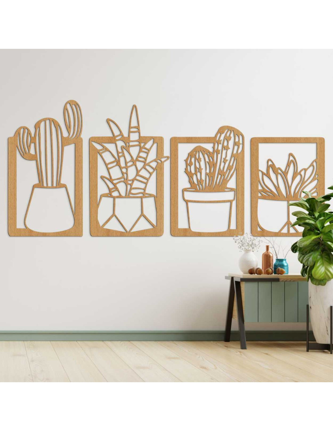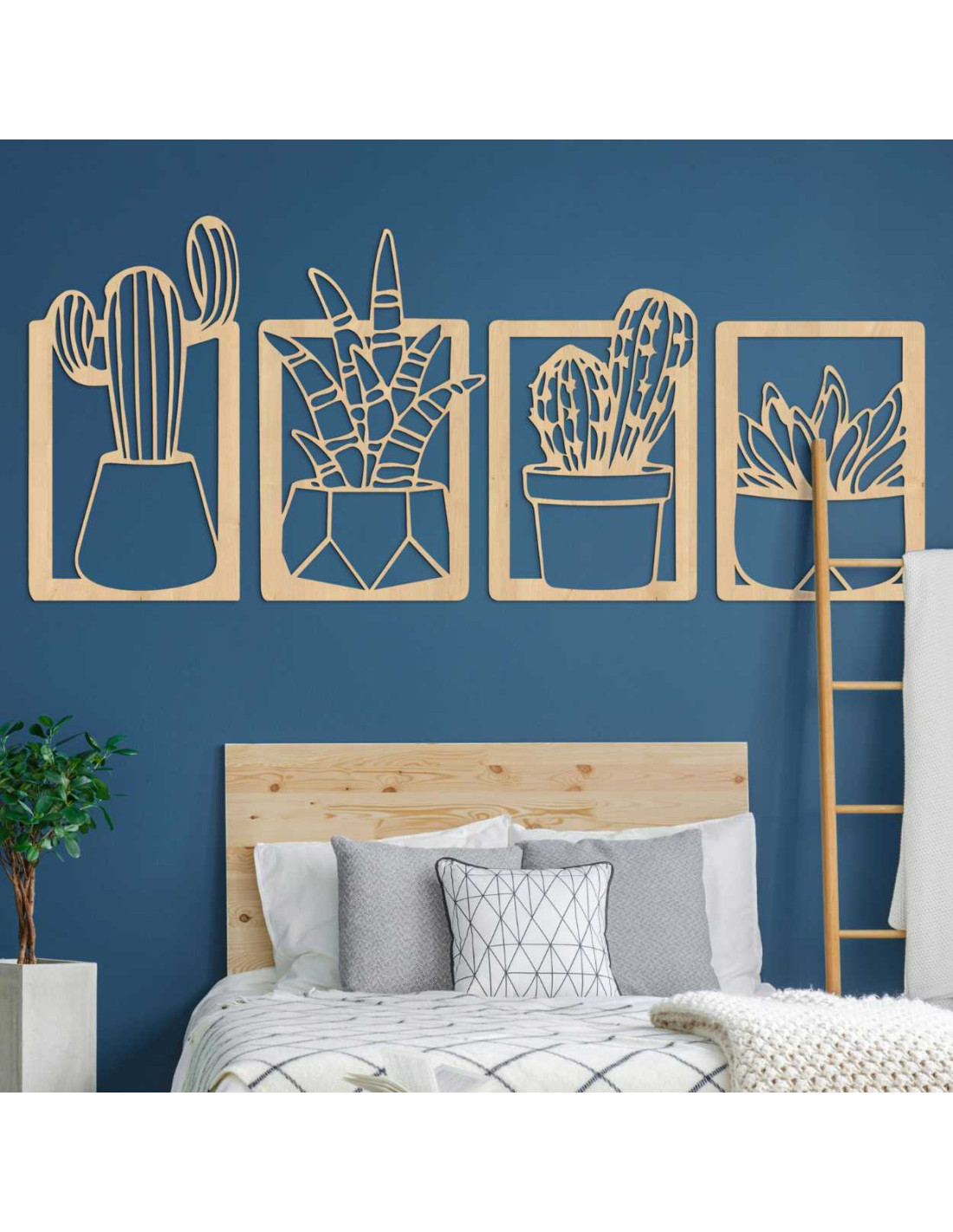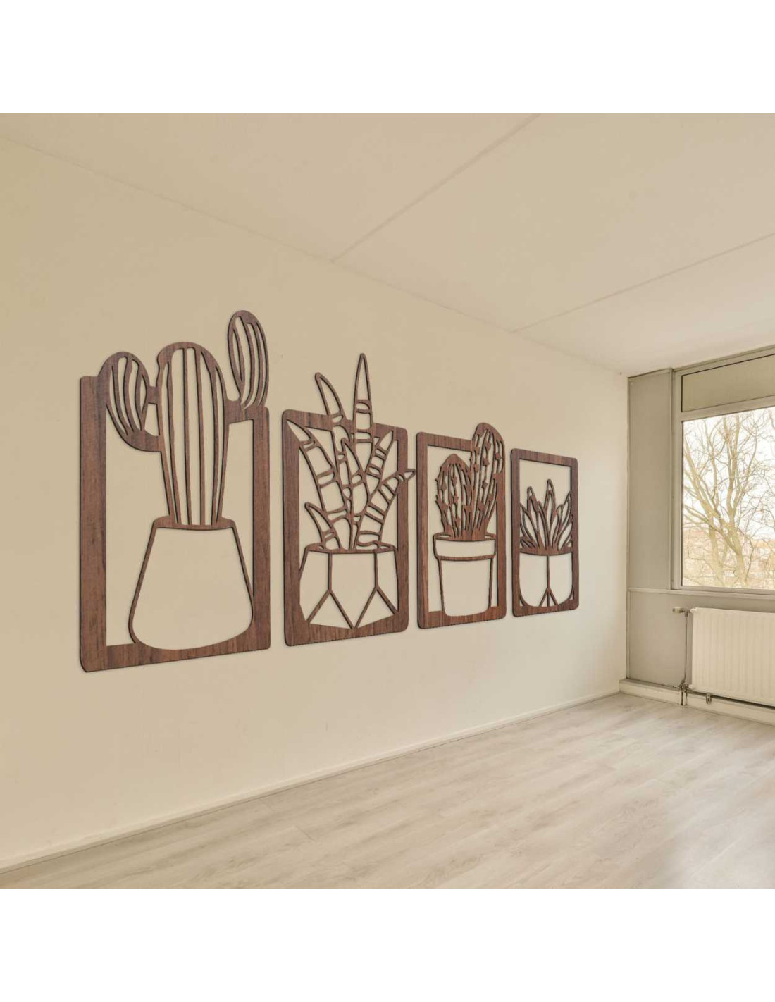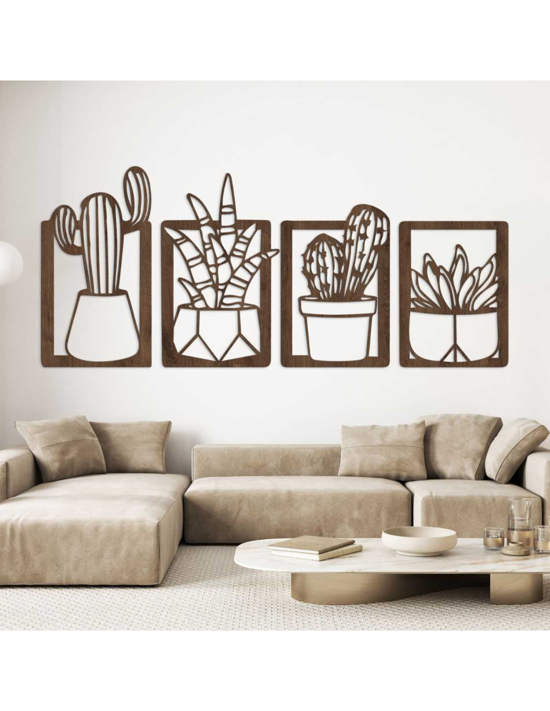 Modern wooden wall decoration with a plant motif of cacti represents stylish workmanship and delicate design.