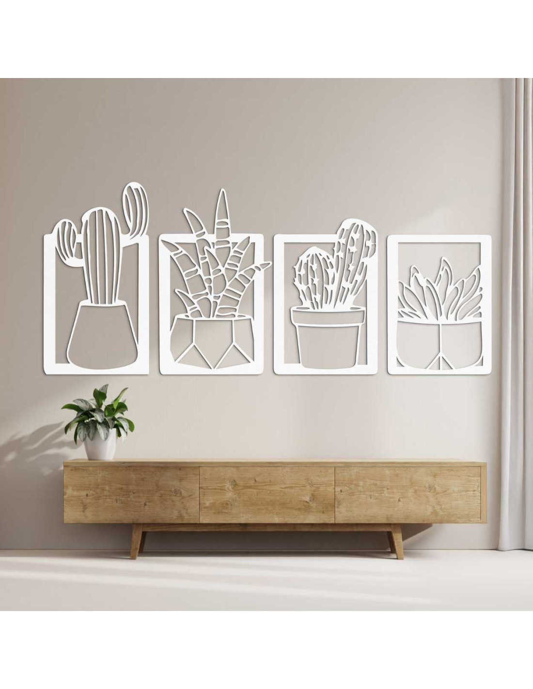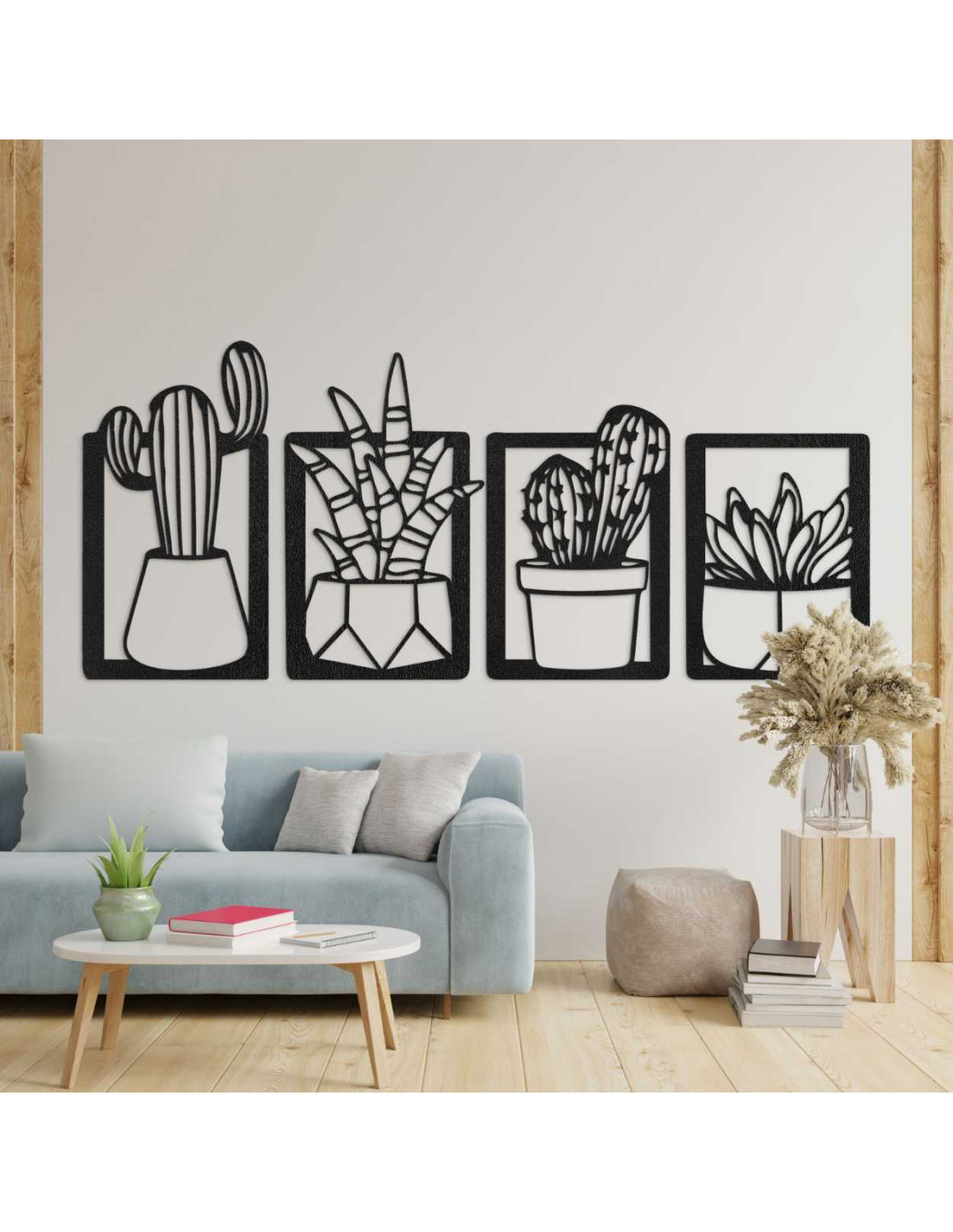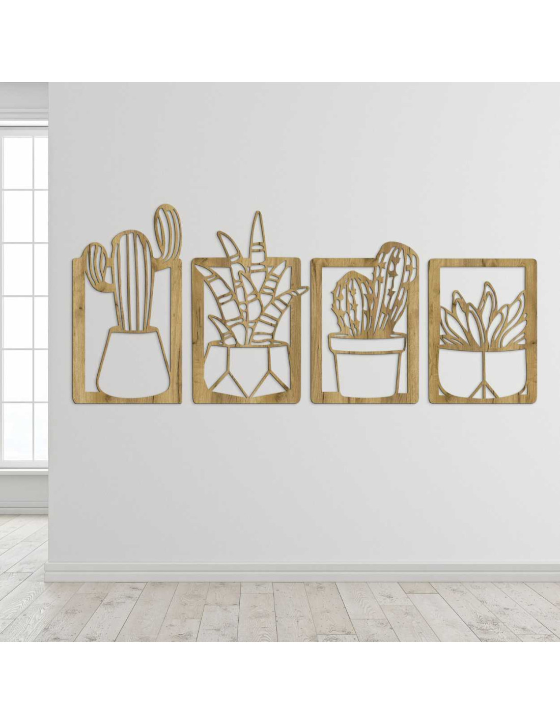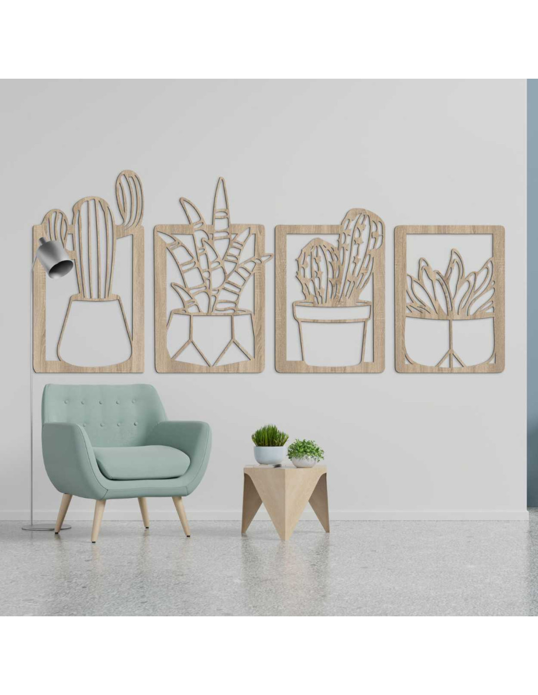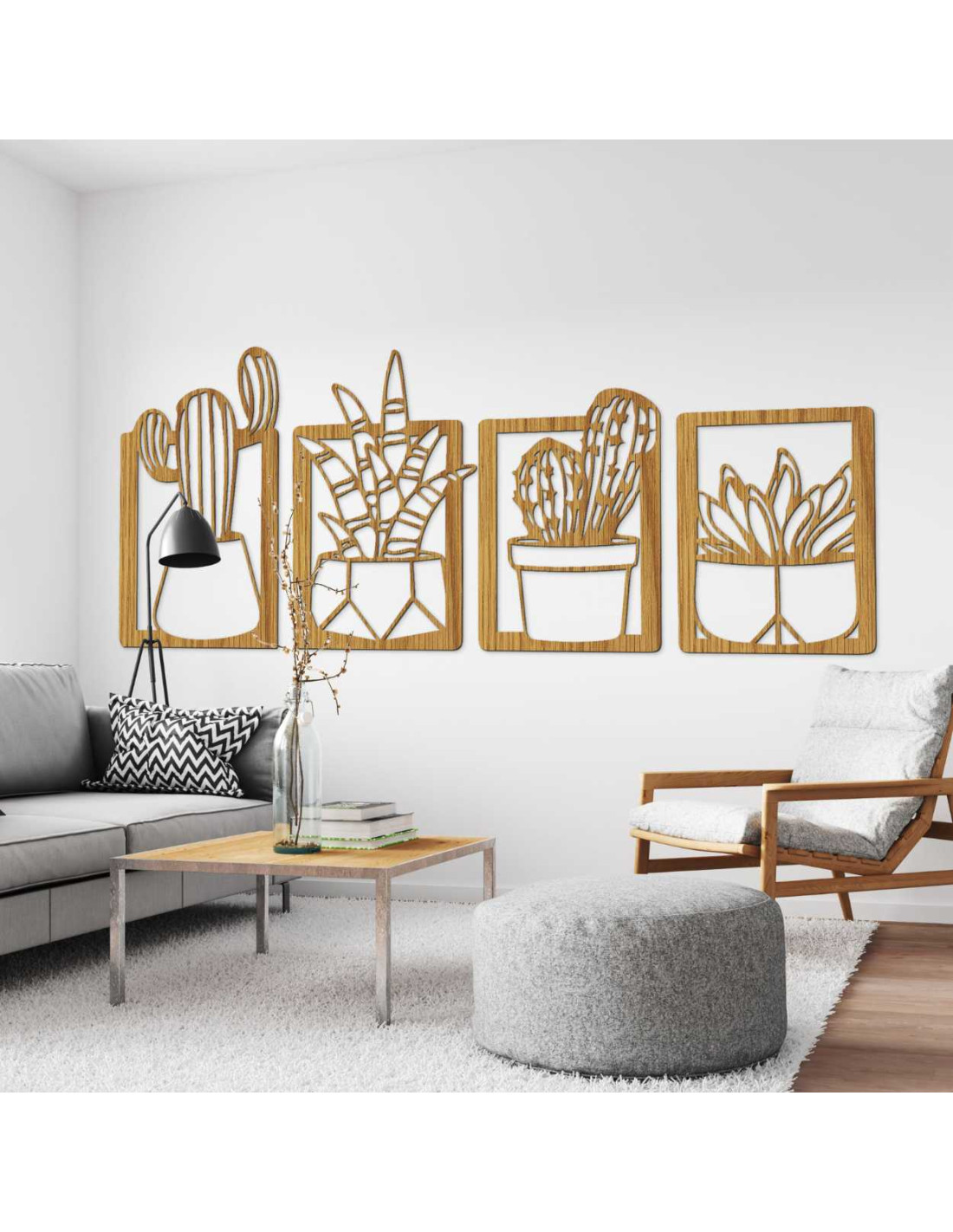 Modern wooden wall decoration with a plant motif of cacti represents stylish workmanship and delicate design.