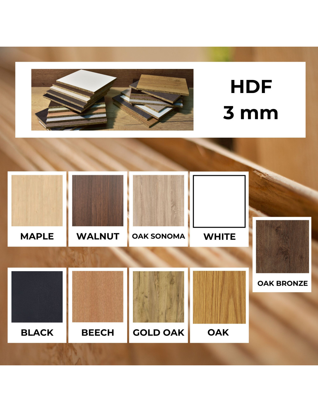 Plywood has a thickness of 5 mm / HDF has a thickness of 3 mm.