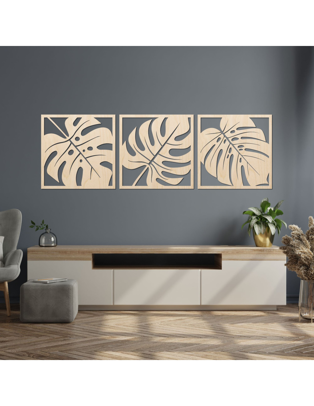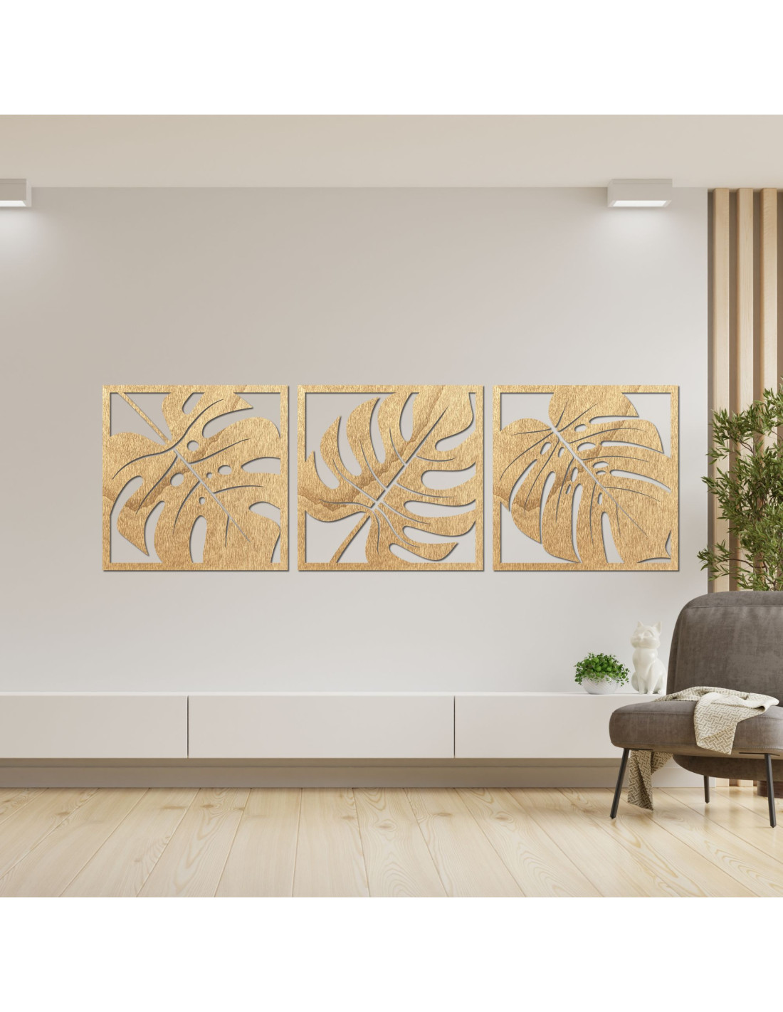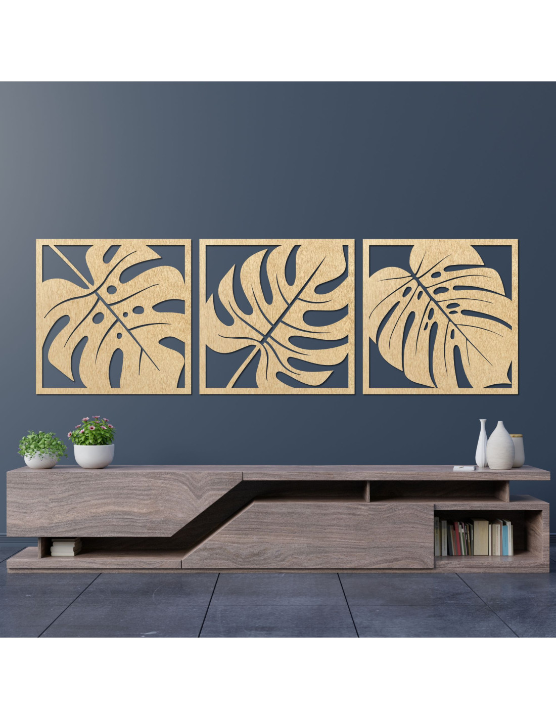 Elegant wooden Monstera painting - modern 3-piece decoration for the living room , bedroom or study .