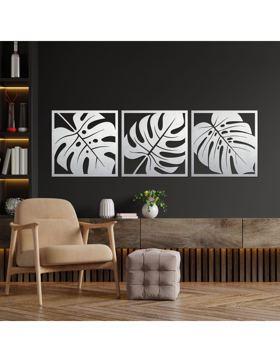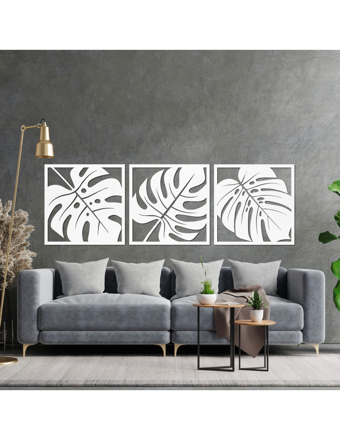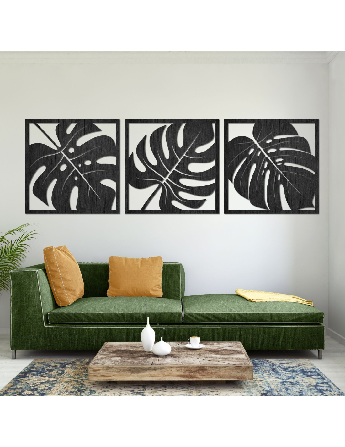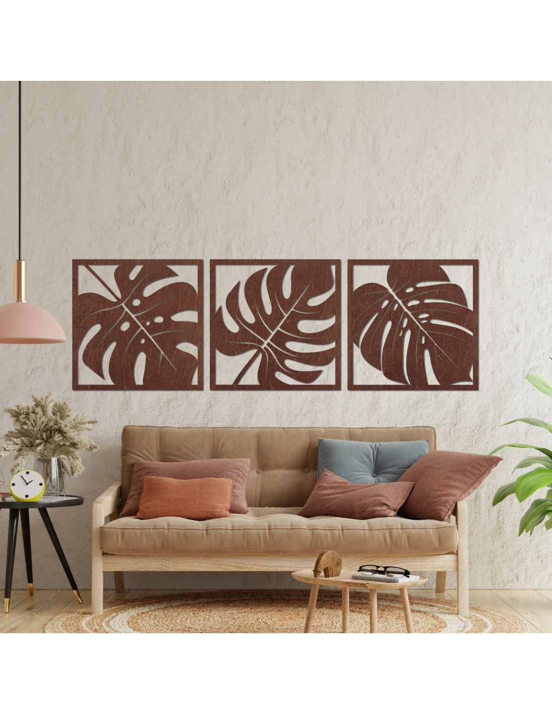 Elegant wooden Monstera painting - modern 3-piece decoration for the living room , bedroom or study .
