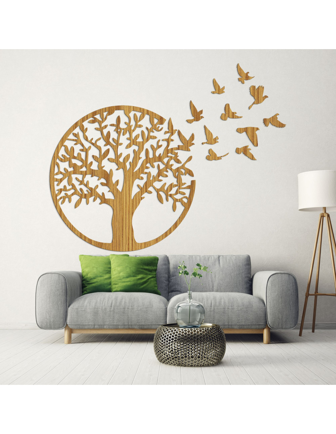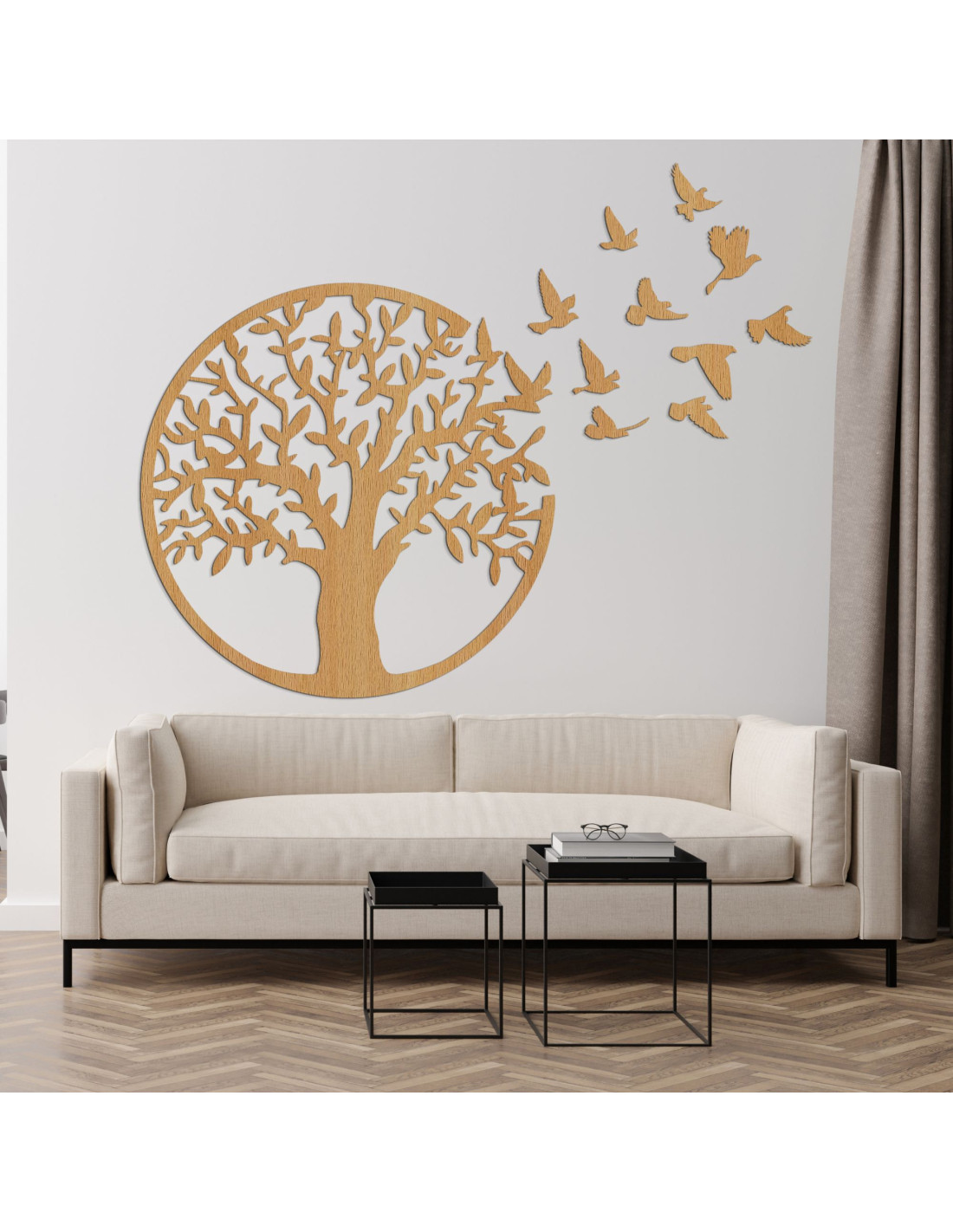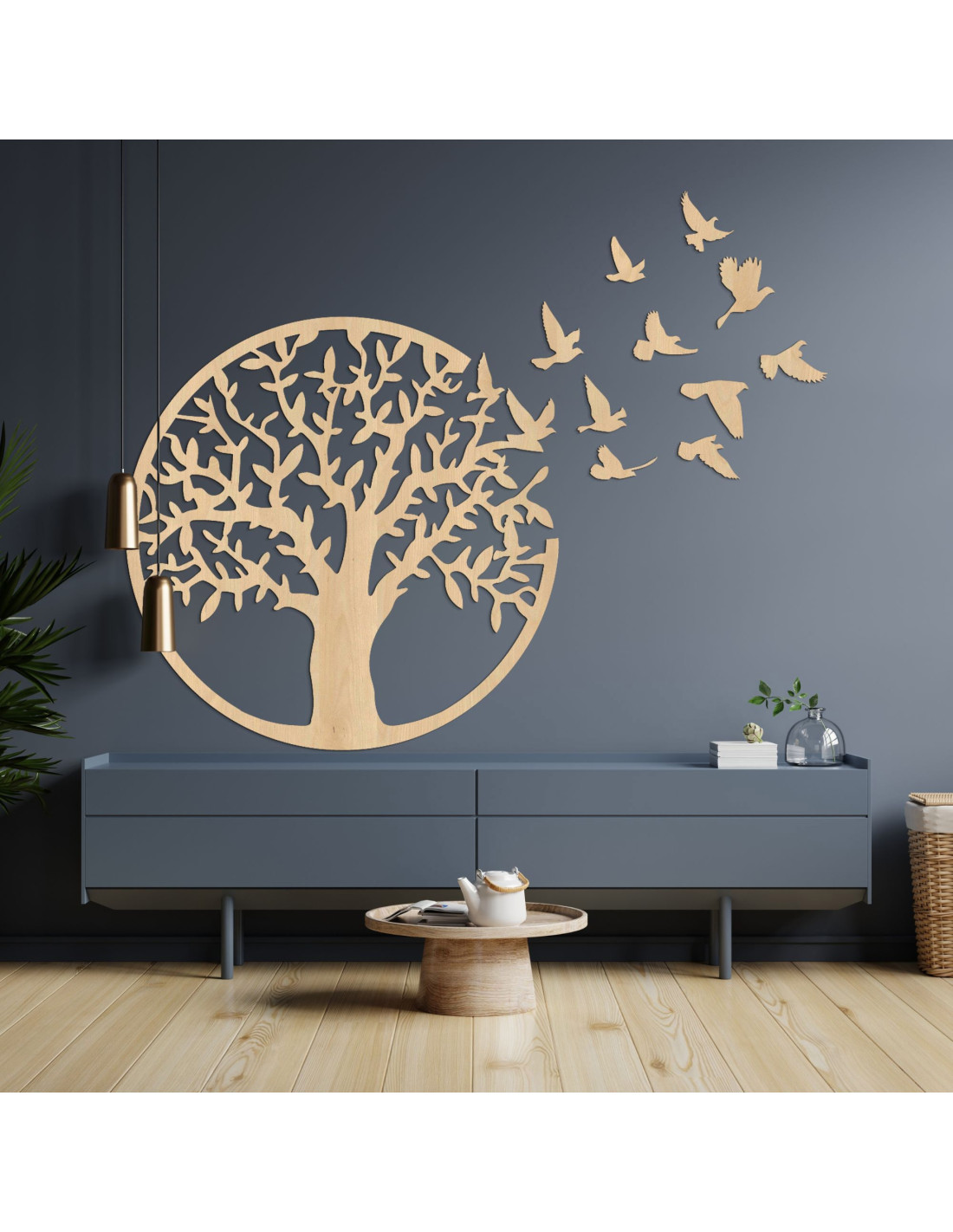 Brighten up your interior with an elegant wooden wall decor that captures the beauty of a tree with soaring birds. This unique piece of art is perfect for those looking for modern and natural accents in their spaces.