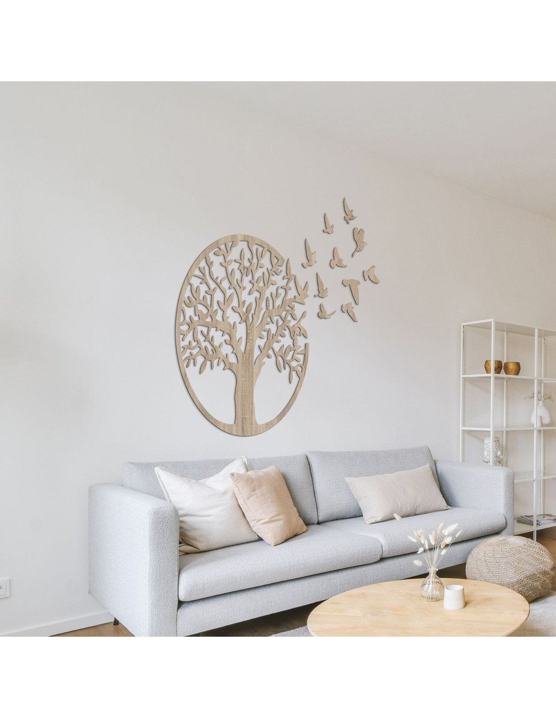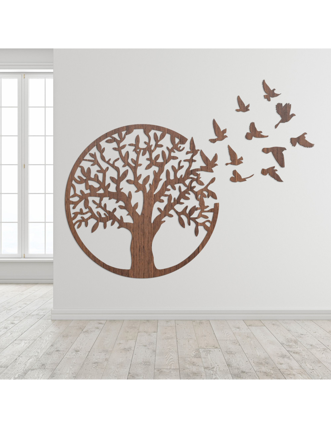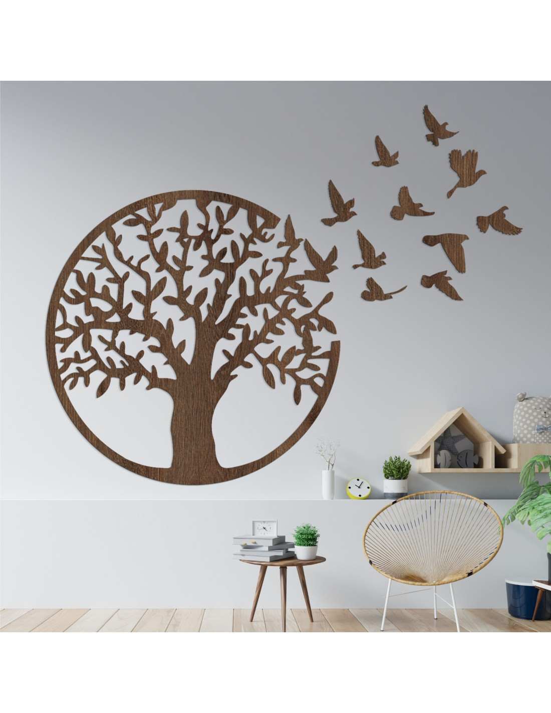 Brighten up your interior with an elegant wooden wall decor that captures the beauty of a tree with soaring birds. This unique piece of art is perfect for those looking for modern and natural accents in their spaces.