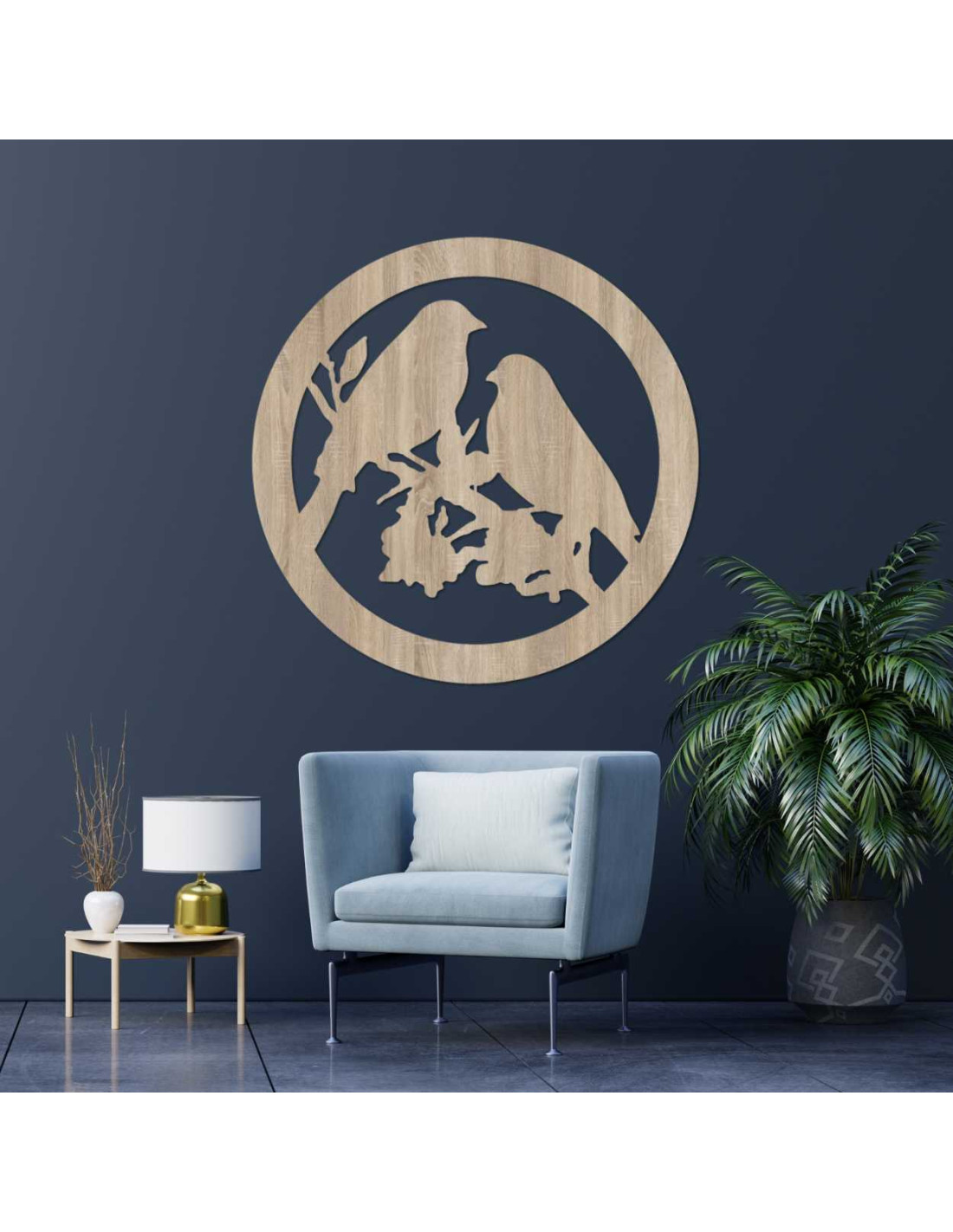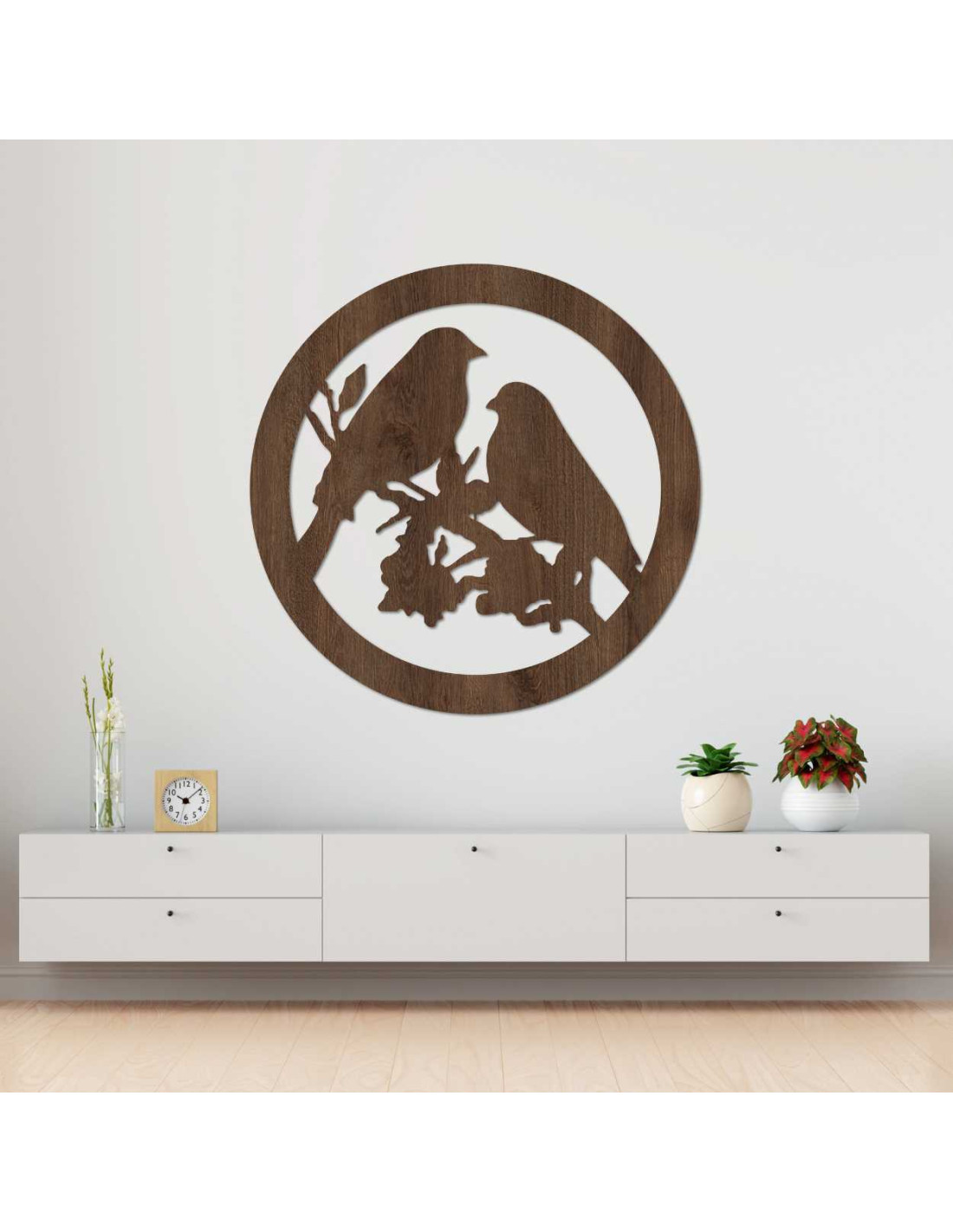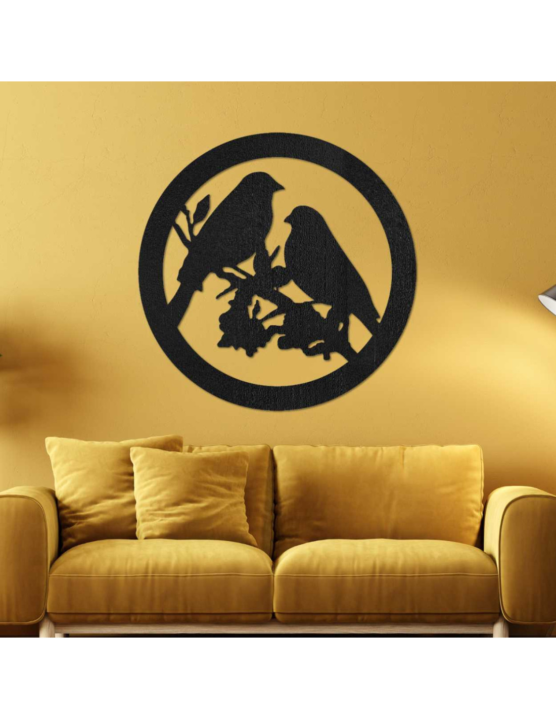 The decorative painting with the motif of two birds on a branch in a circular design exudes delicacy and natural charm.