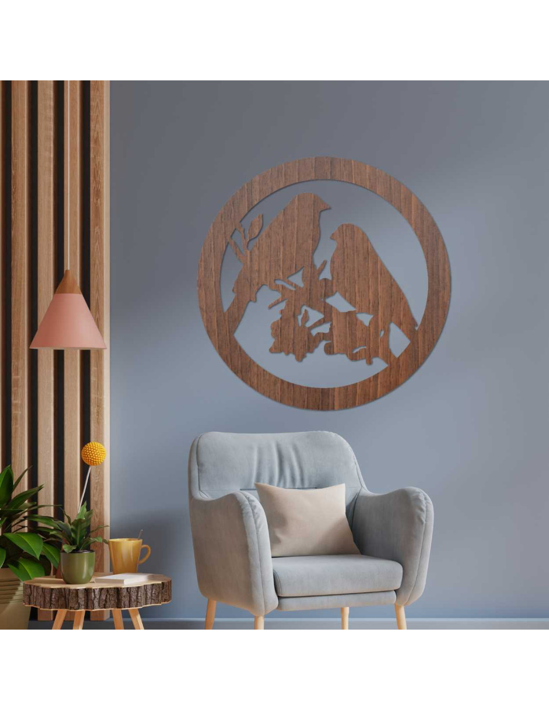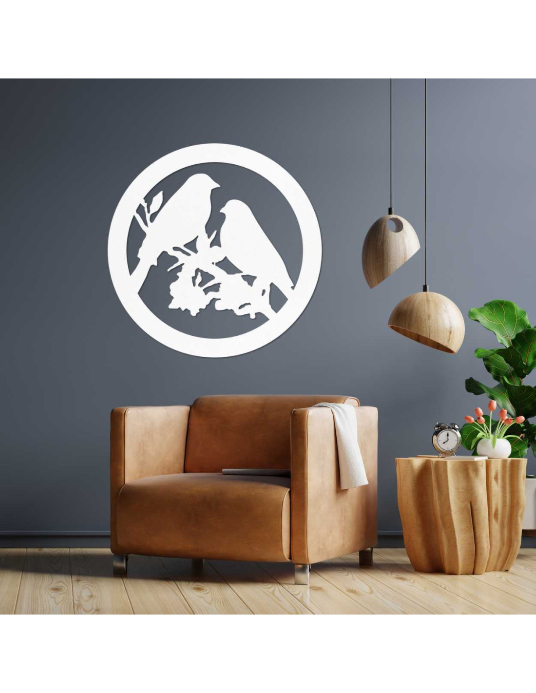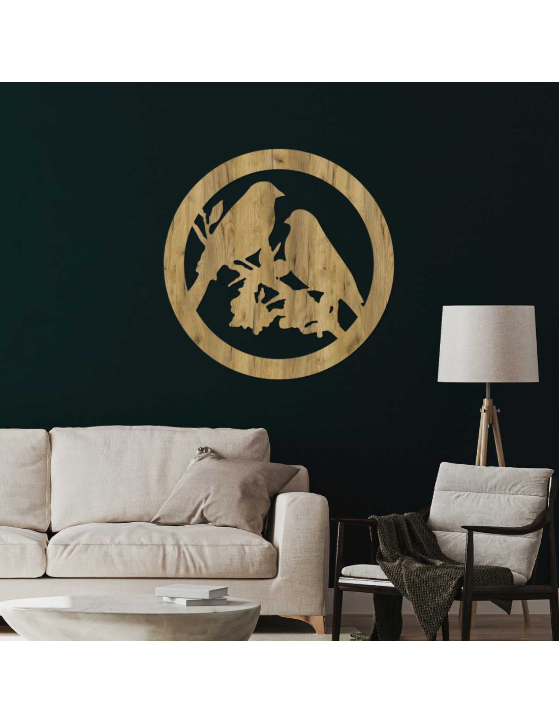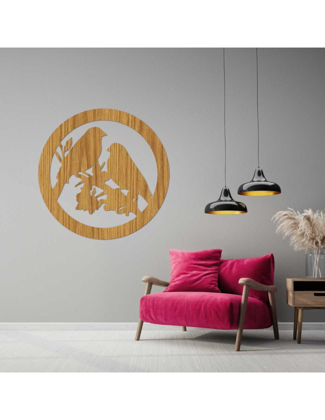 The decorative painting with the motif of two birds on a branch in a circular design exudes delicacy and natural charm.