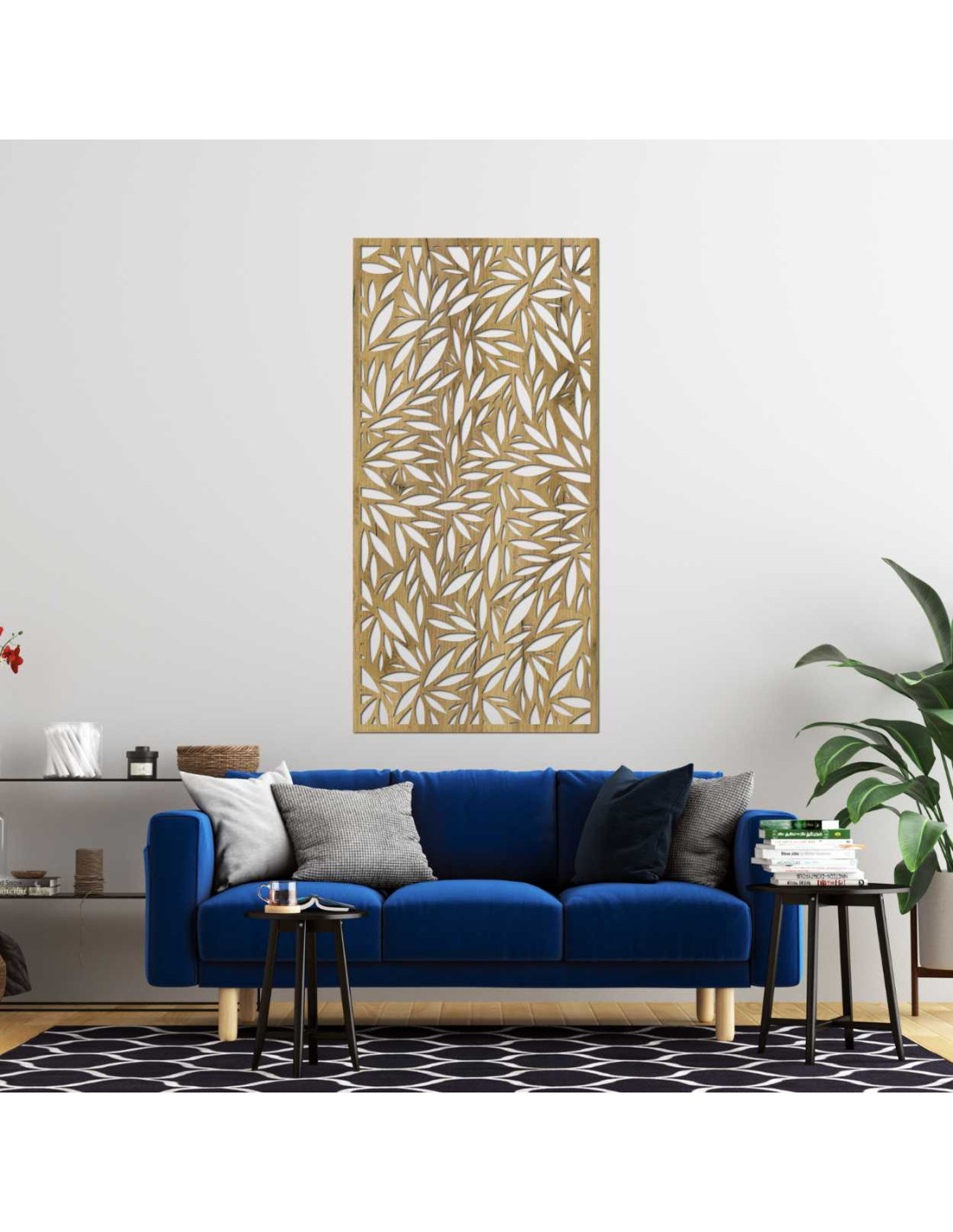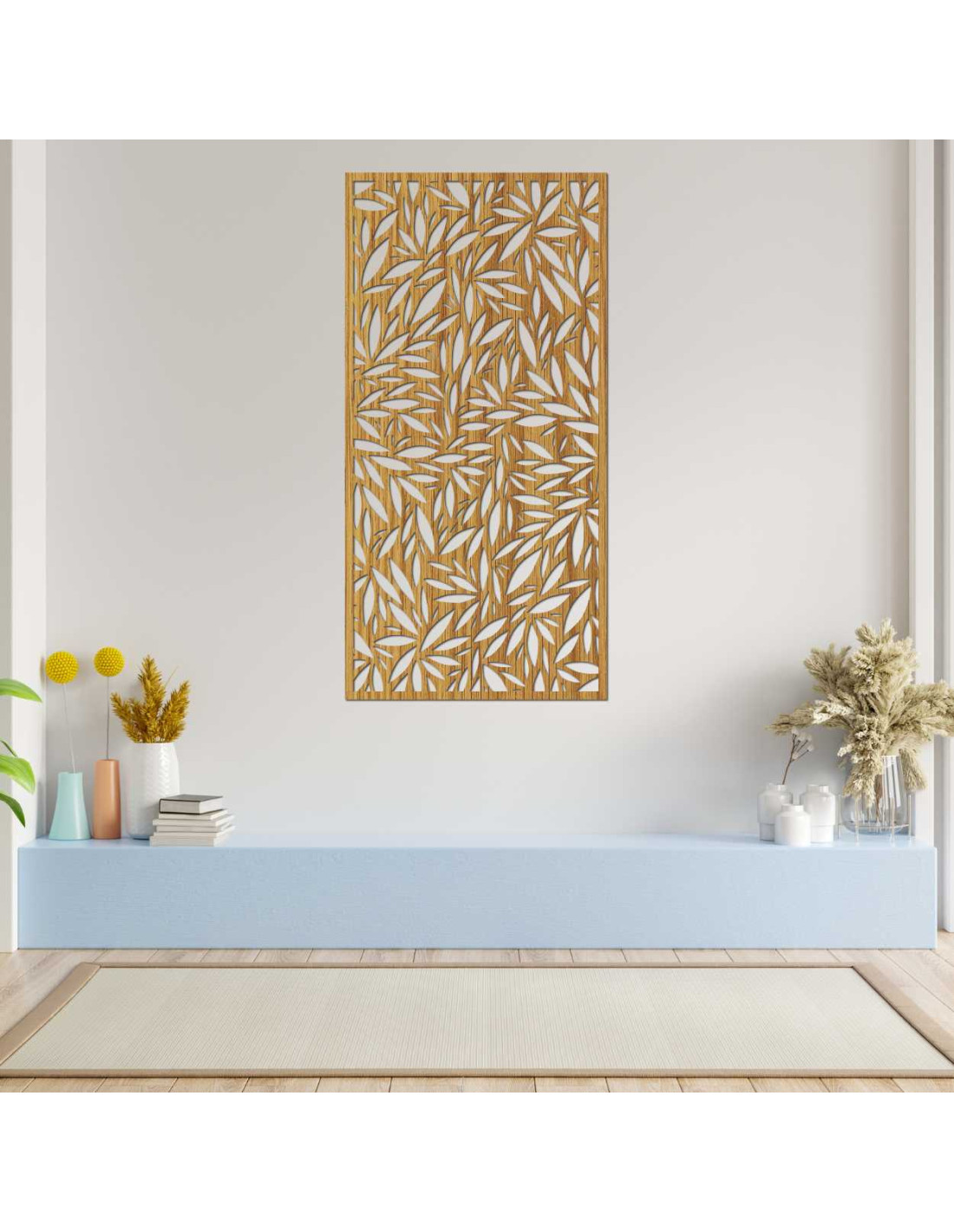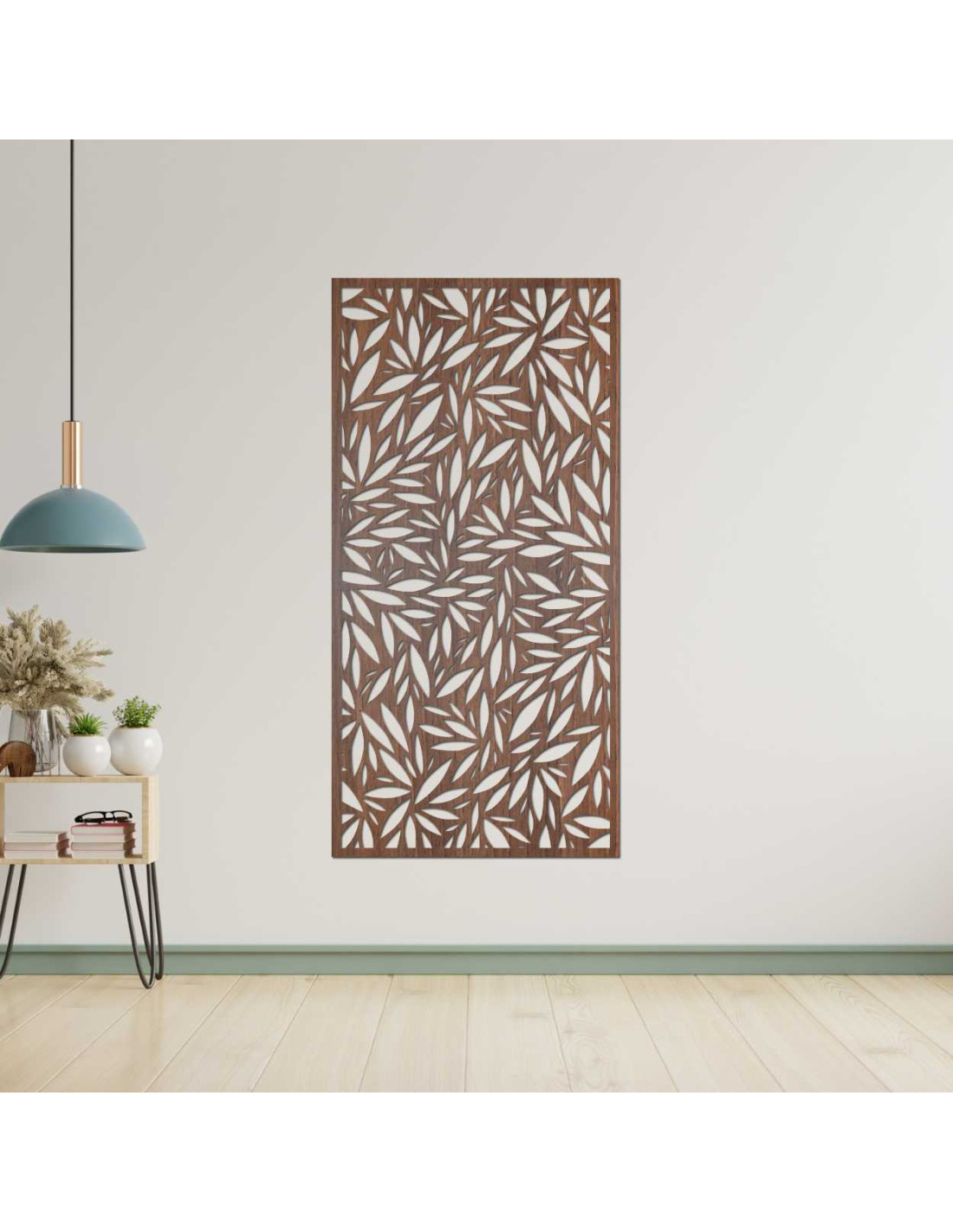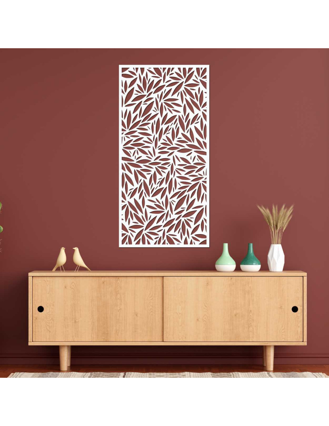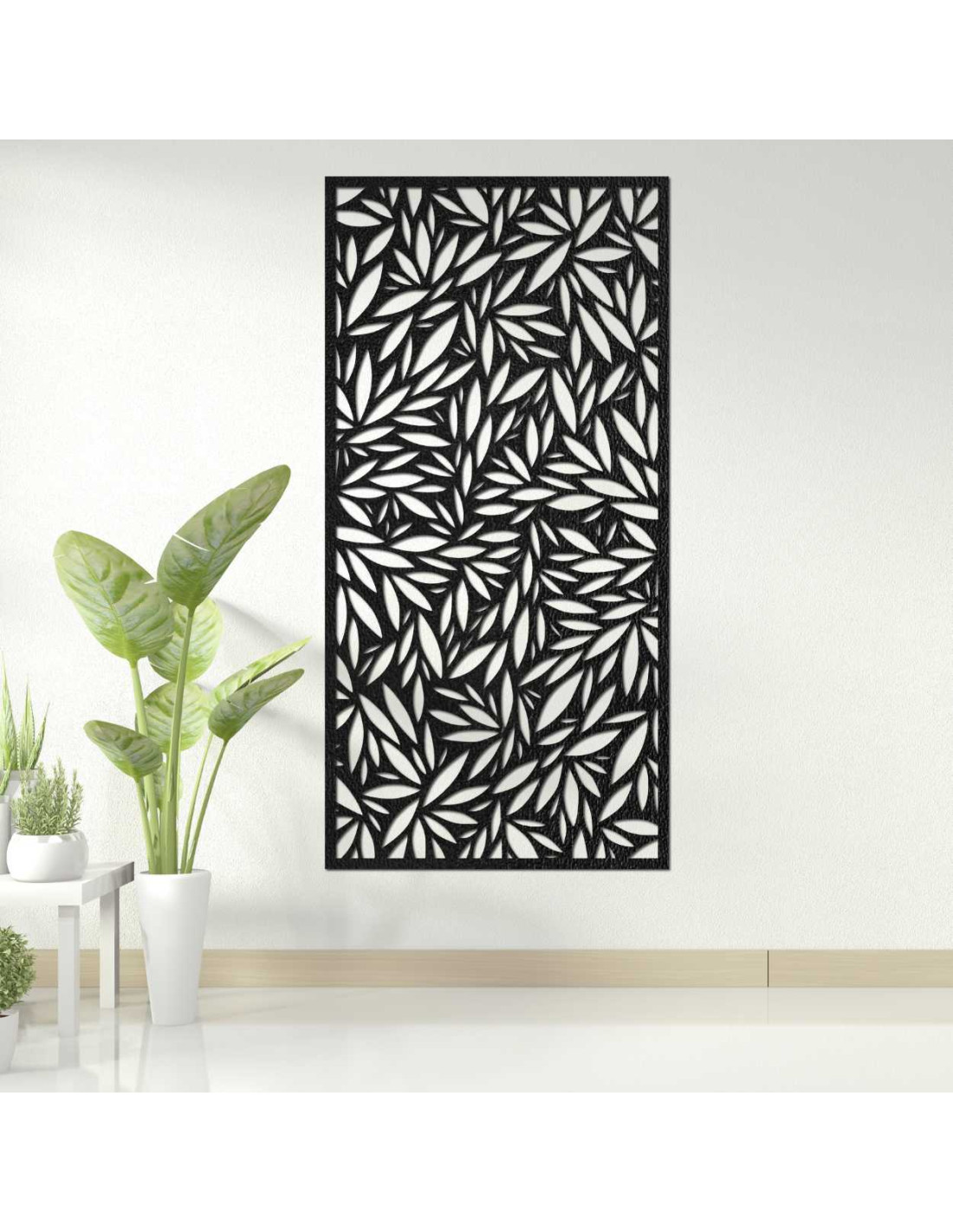 Decorative panel with leaf cutouts on a light wall