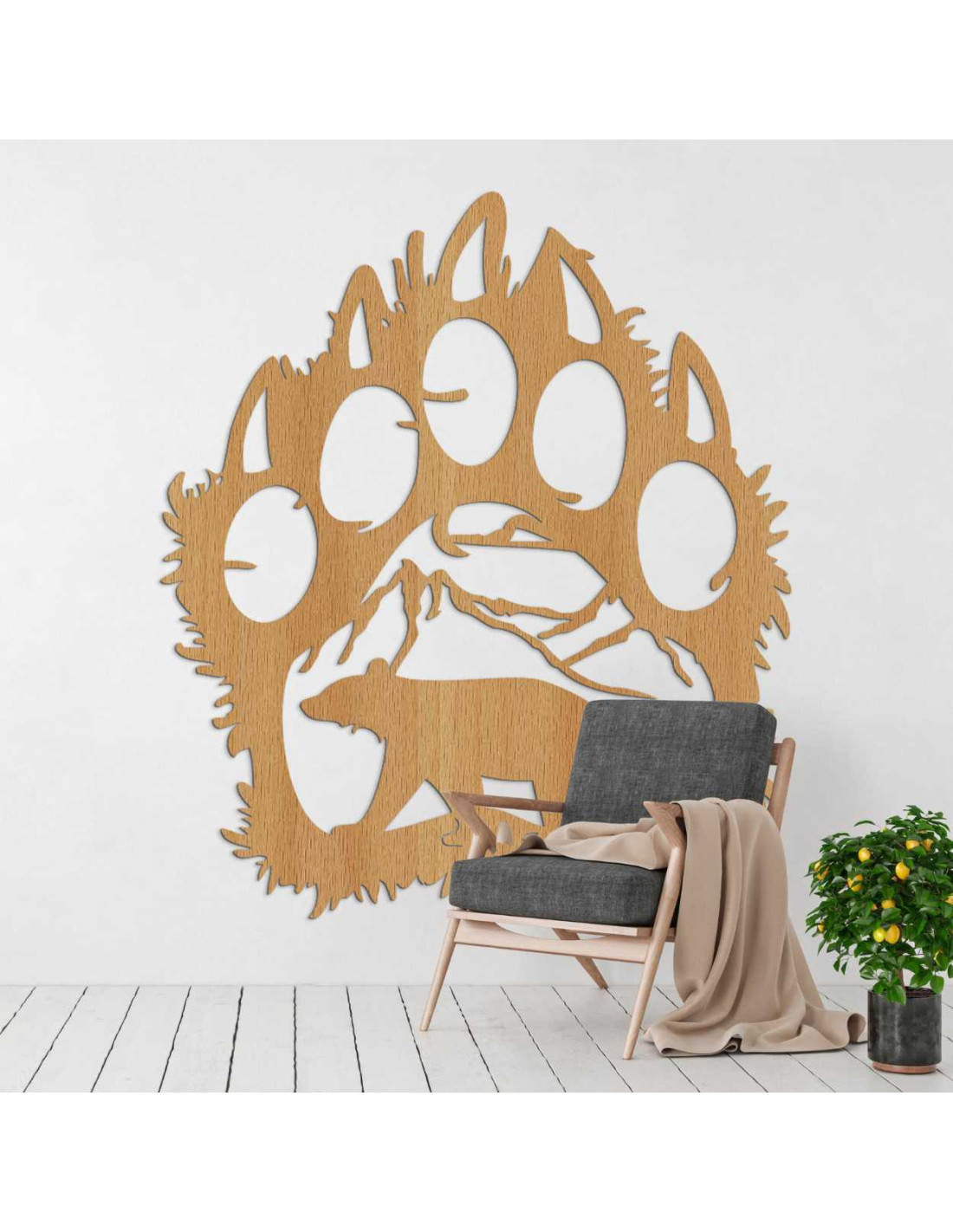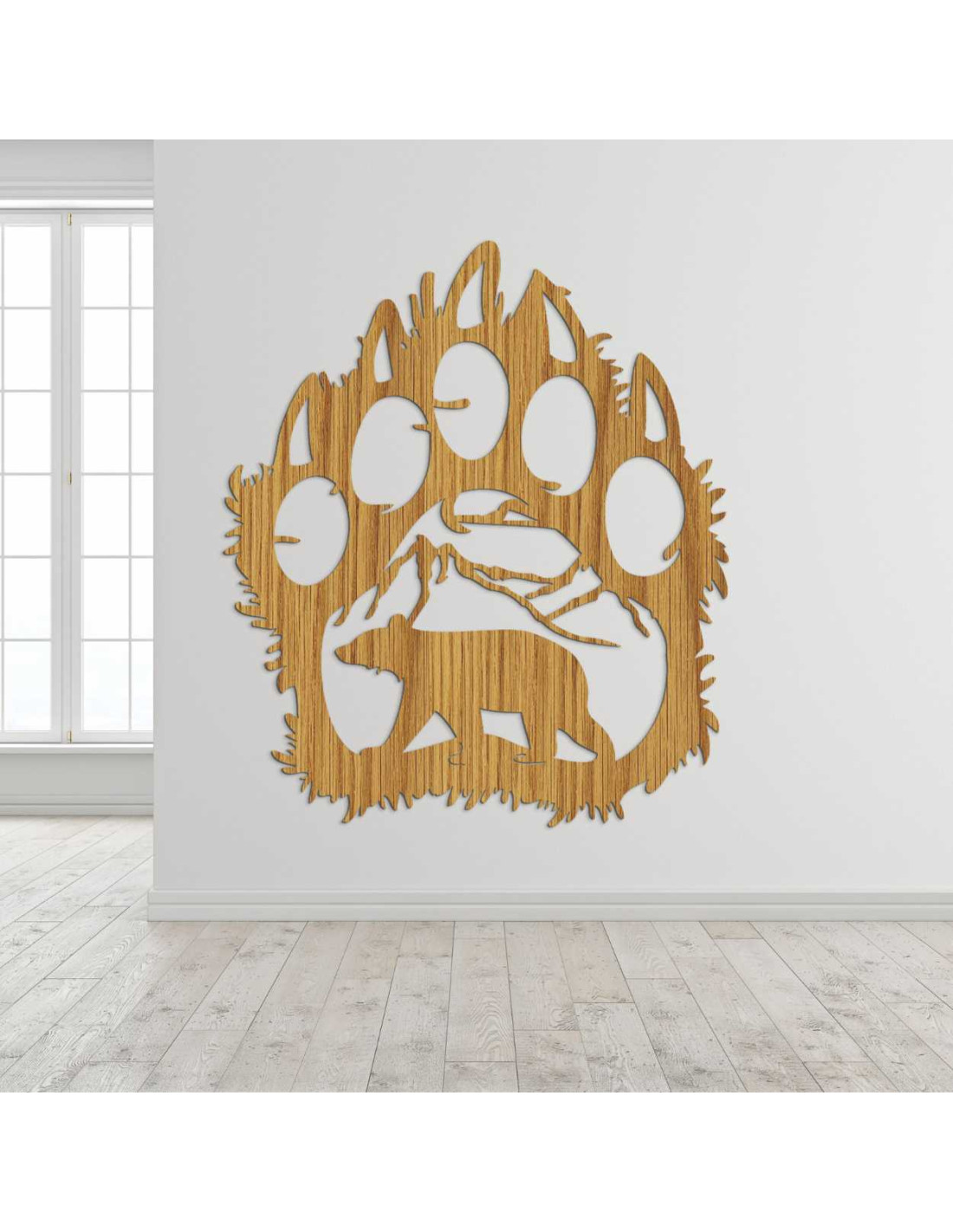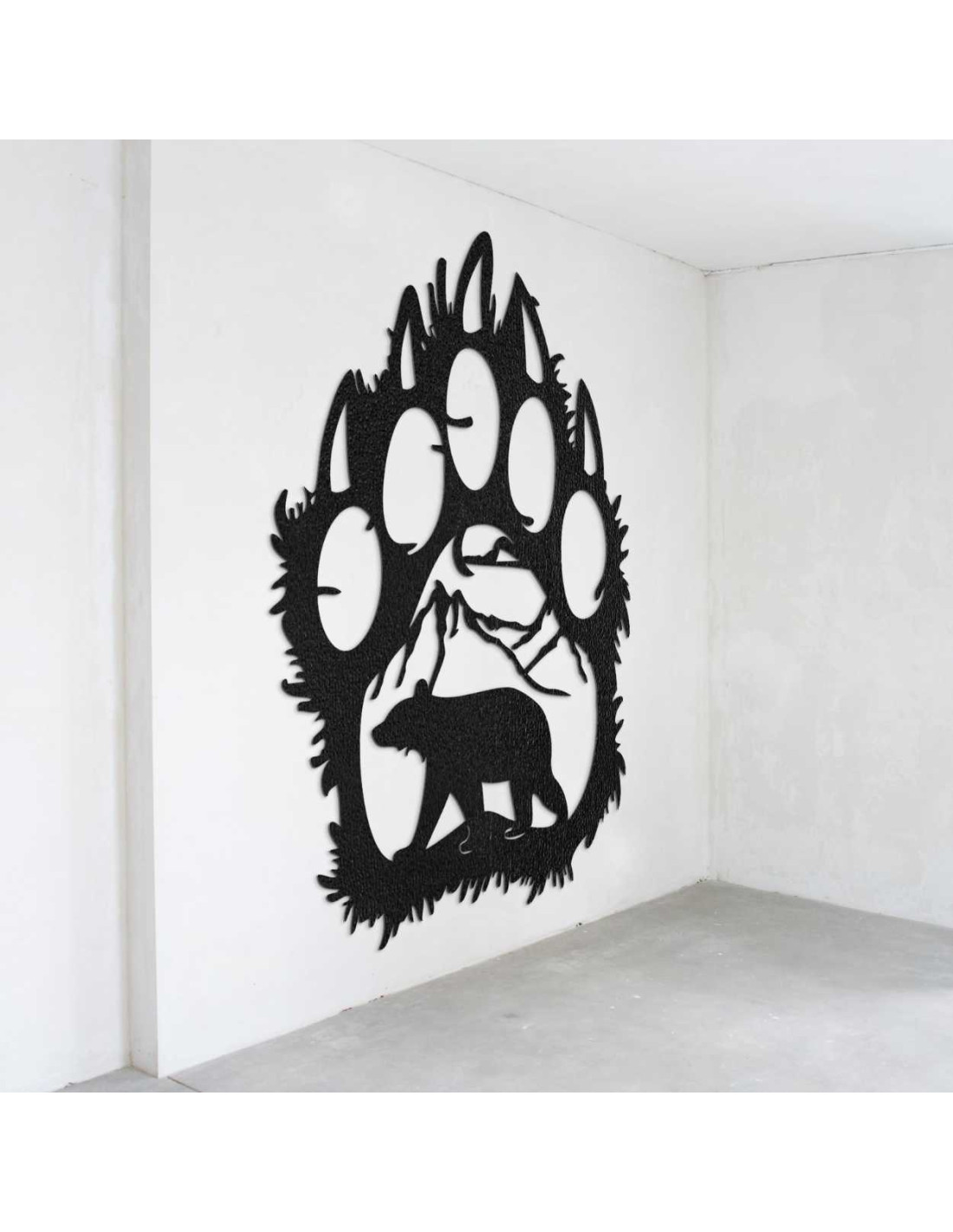 In the center of the bear's paw is carved the silhouette of a bear walking under a mountain range.
