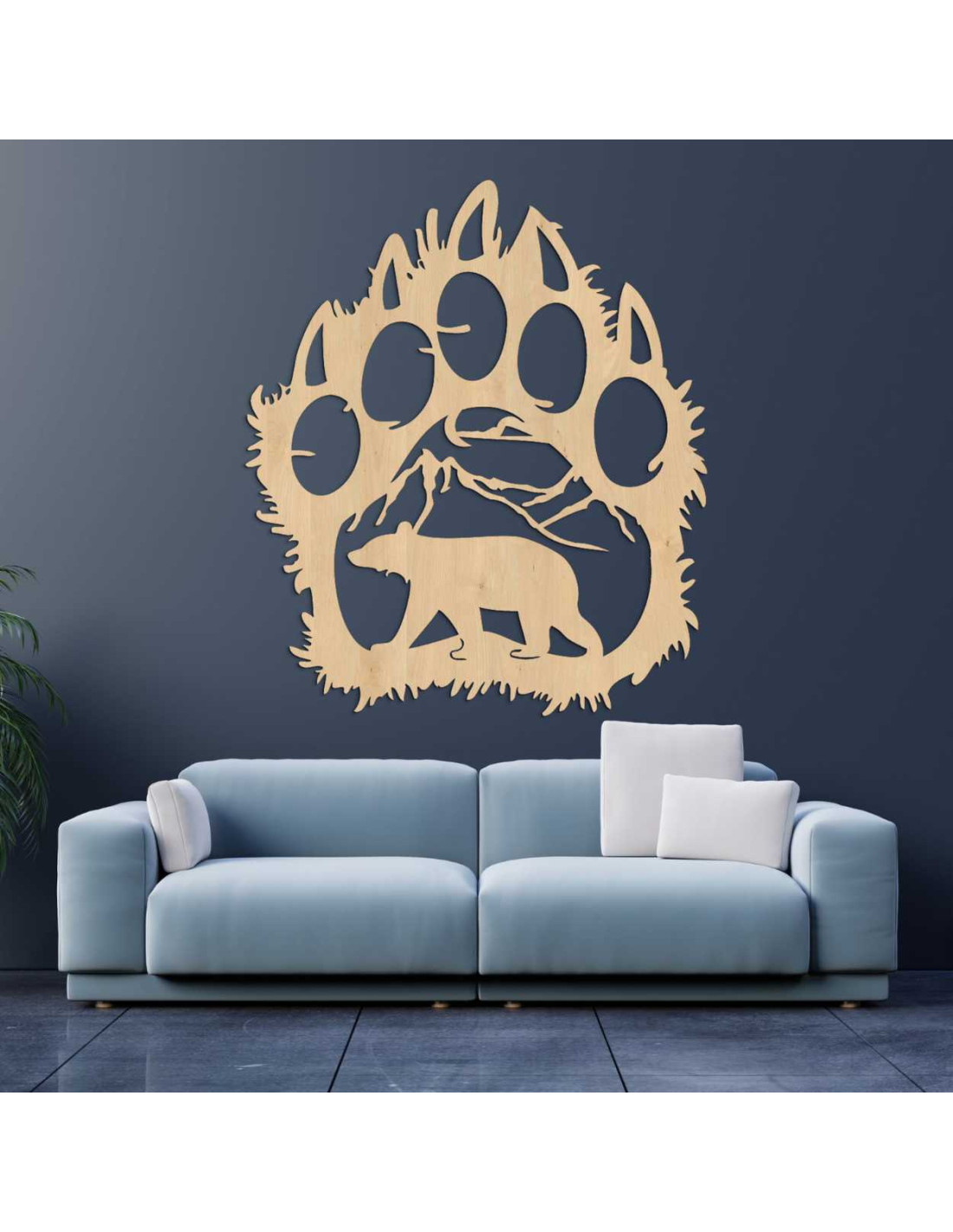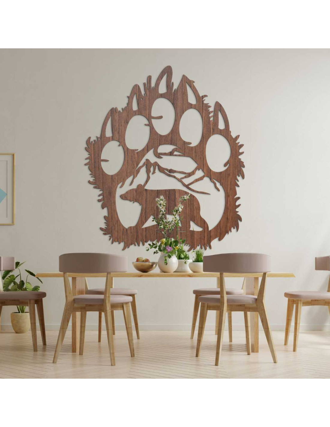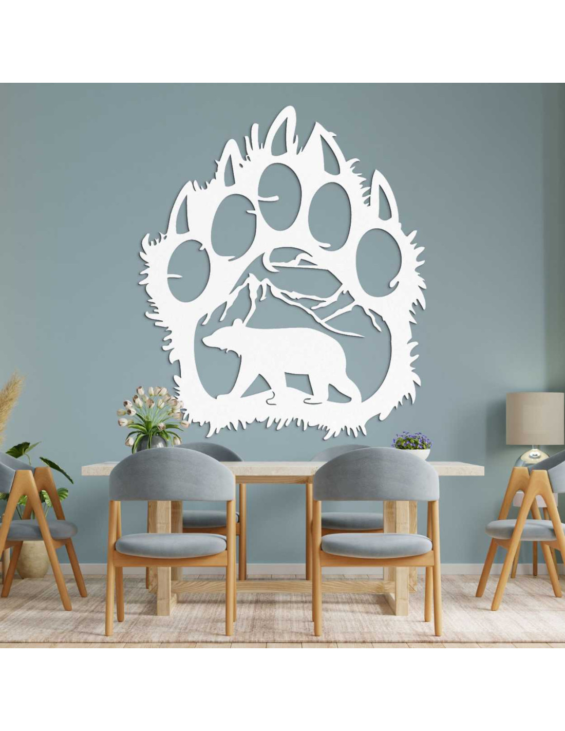 The dynamic silhouette of a bear track complemented by natural scenes brings character and depth to the space.