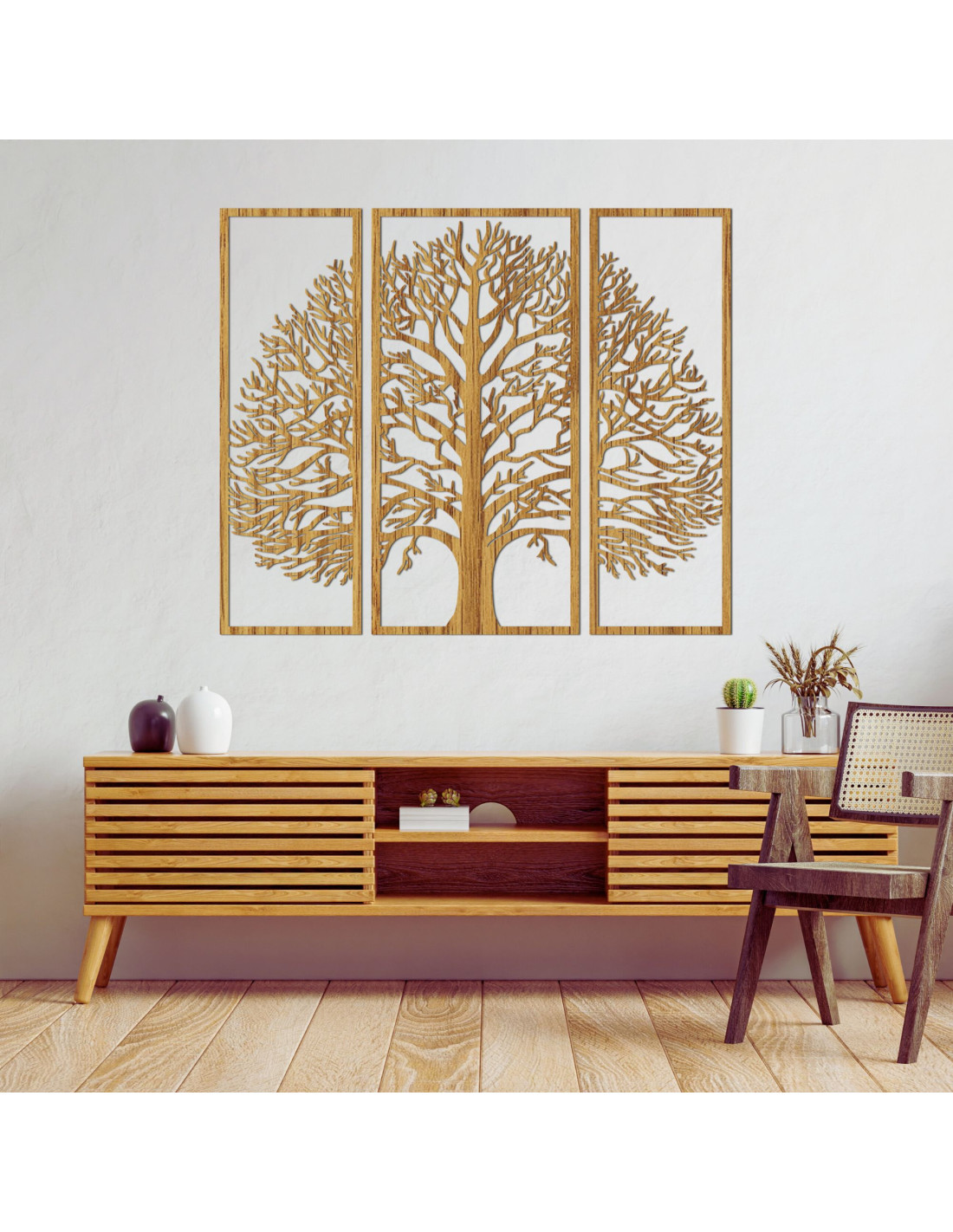 The three-piece wooden decoration Tree of Life is an elegant and timeless accessory that will add harmony, peace, and style to your home.