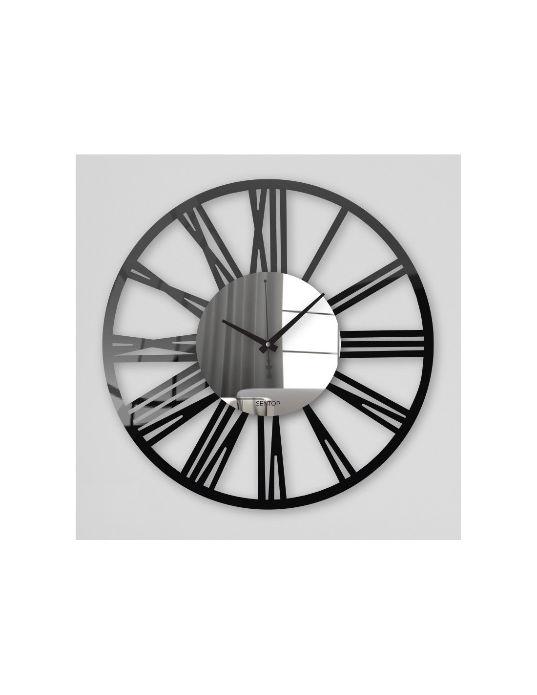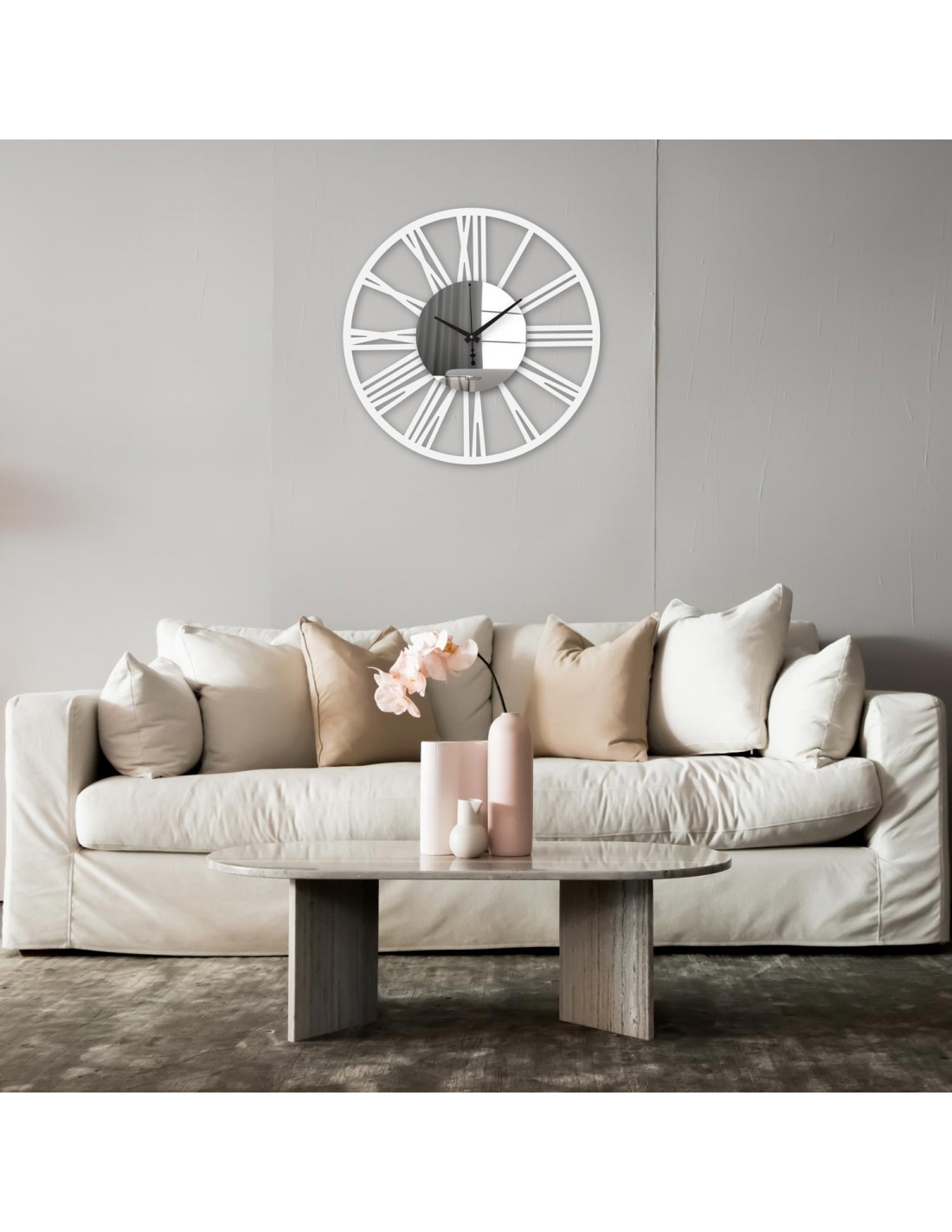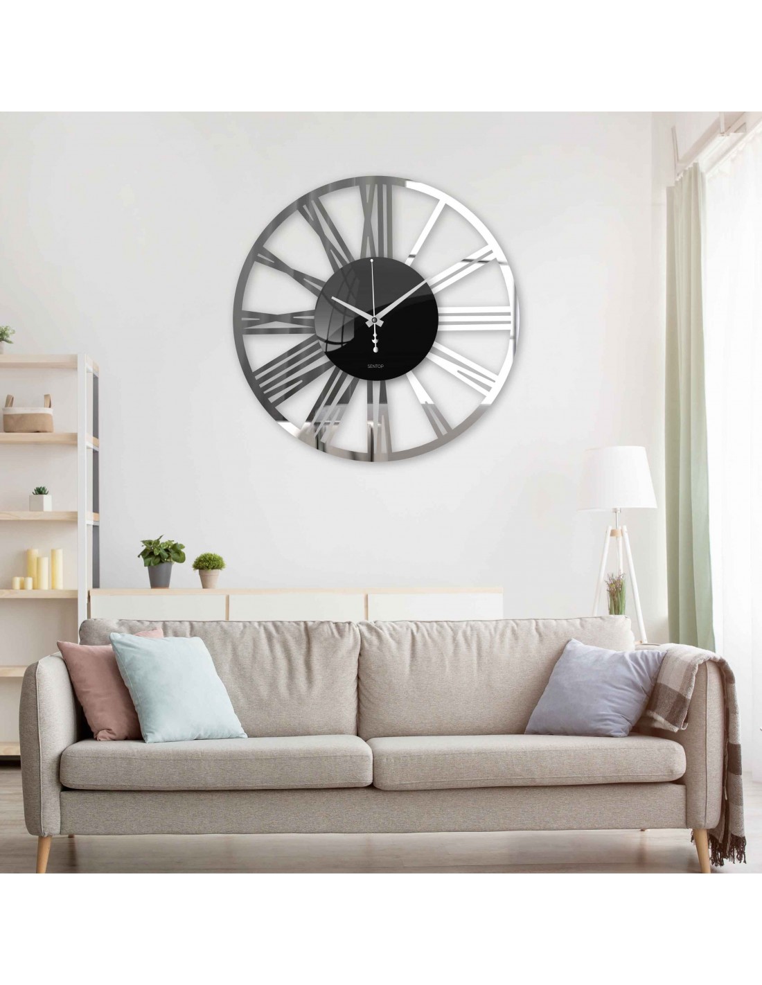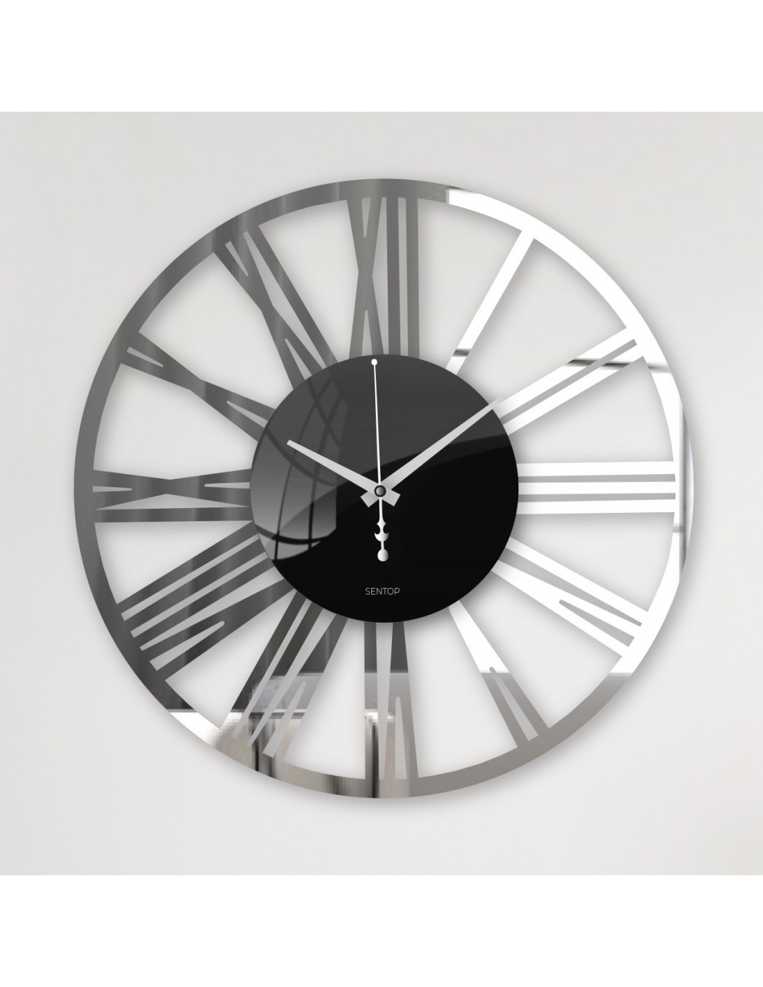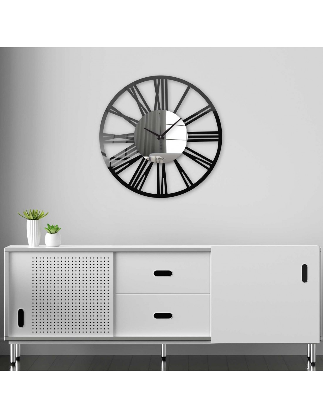 This model represents a fusion of modern design, reliable quality and precise workmanship. The black Roman numerals create a visual contrast with the mirrored center that reflects light and the interior, making the clock act as both an artistic accessory and a practical timekeeper.