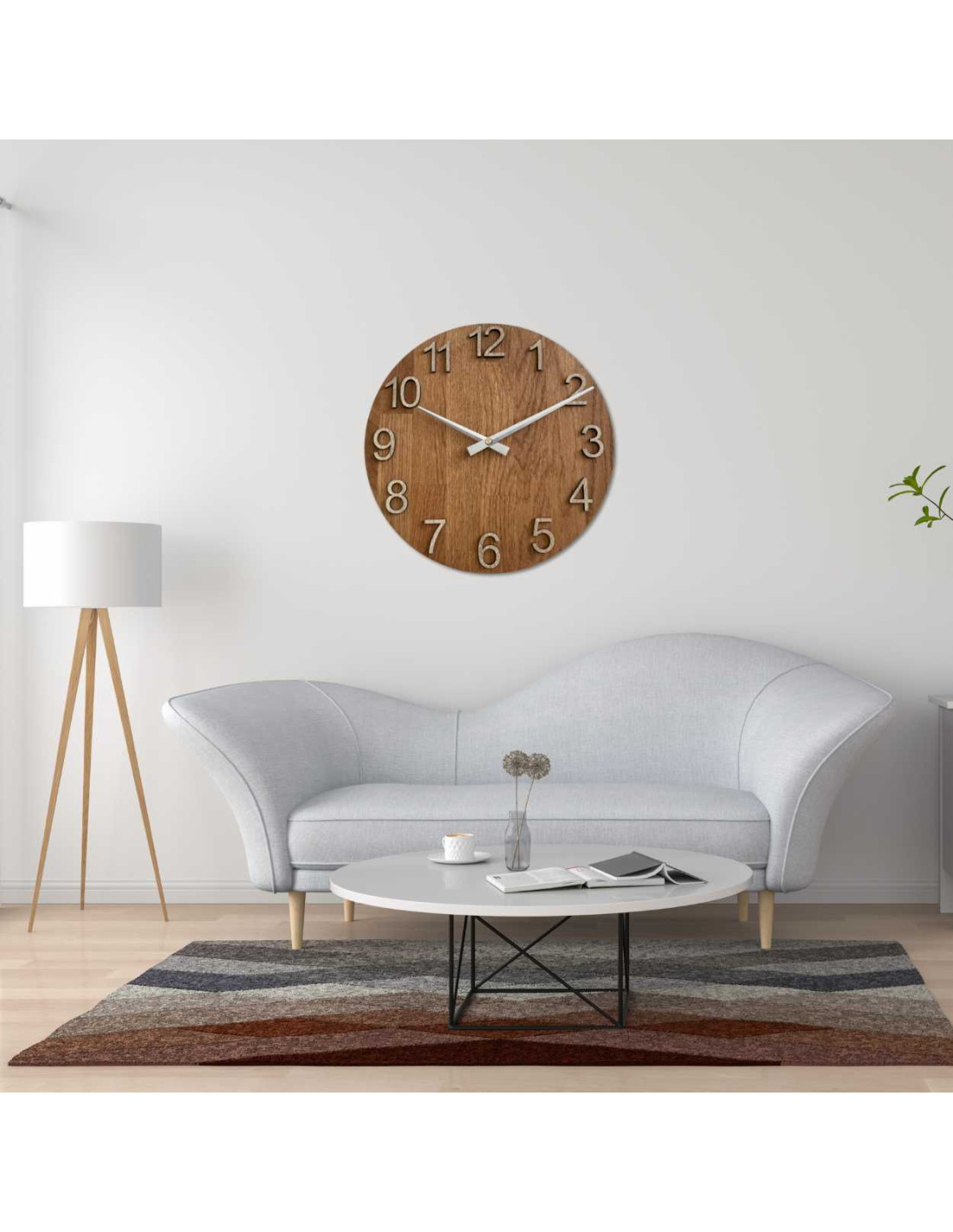 Clock made of solid wood with engraved numbers and a natural pattern.