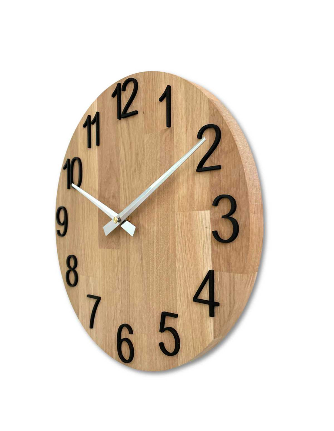 Each clock is made from solid oak panels , which are first precisely cut into the desired shape and size using CNC technology.
