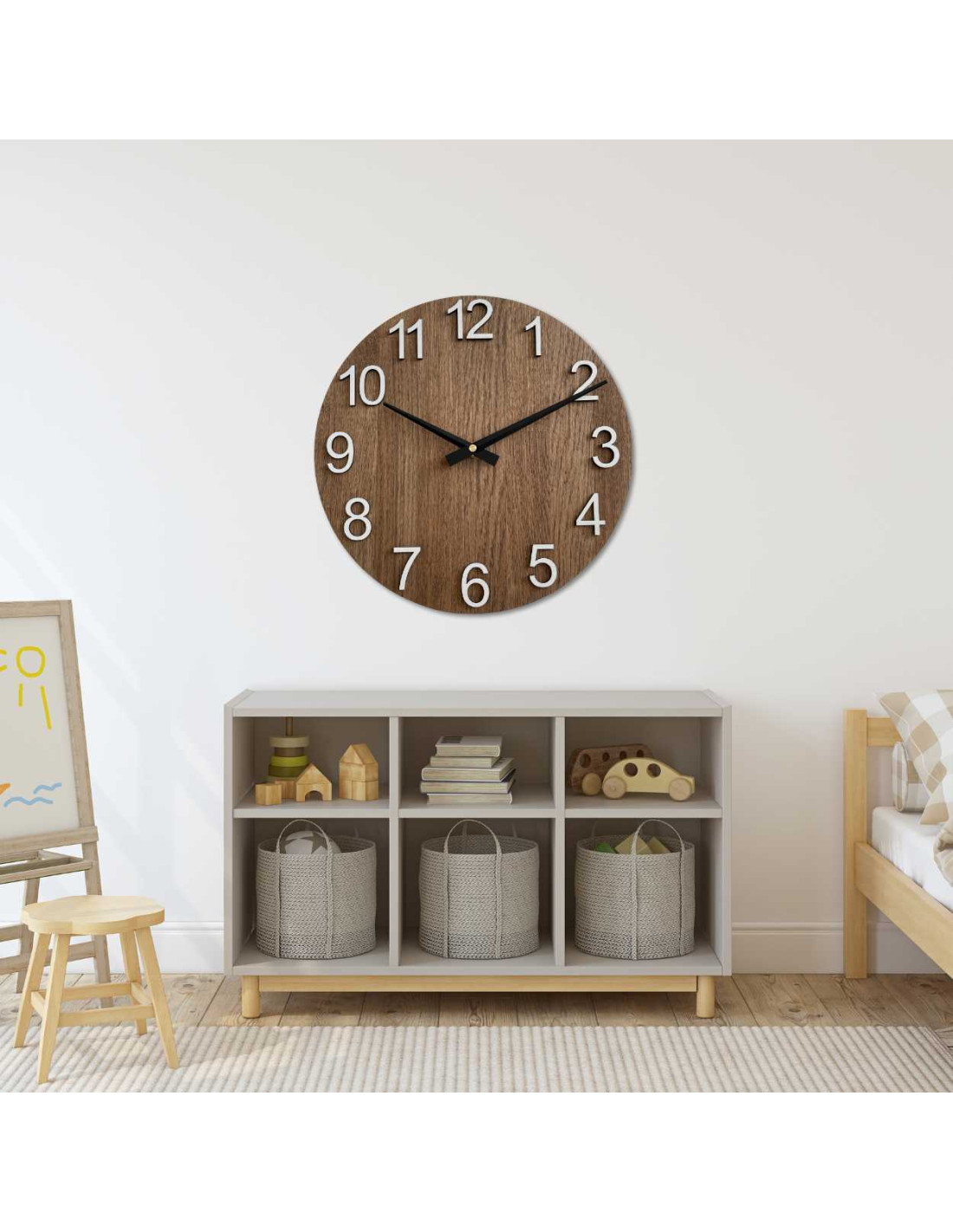 The clock is made of natural wood, which has a warm and harmonious appearance.