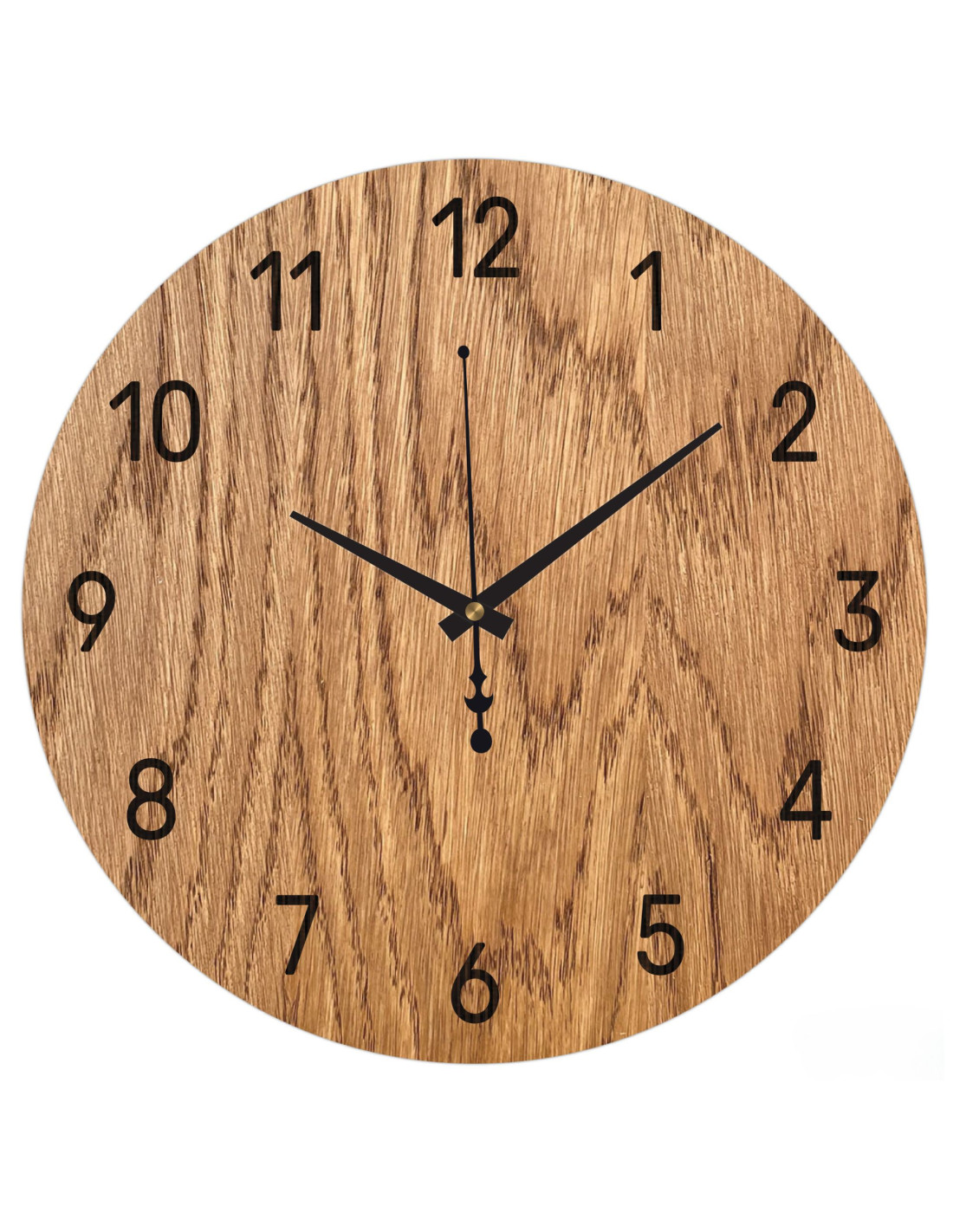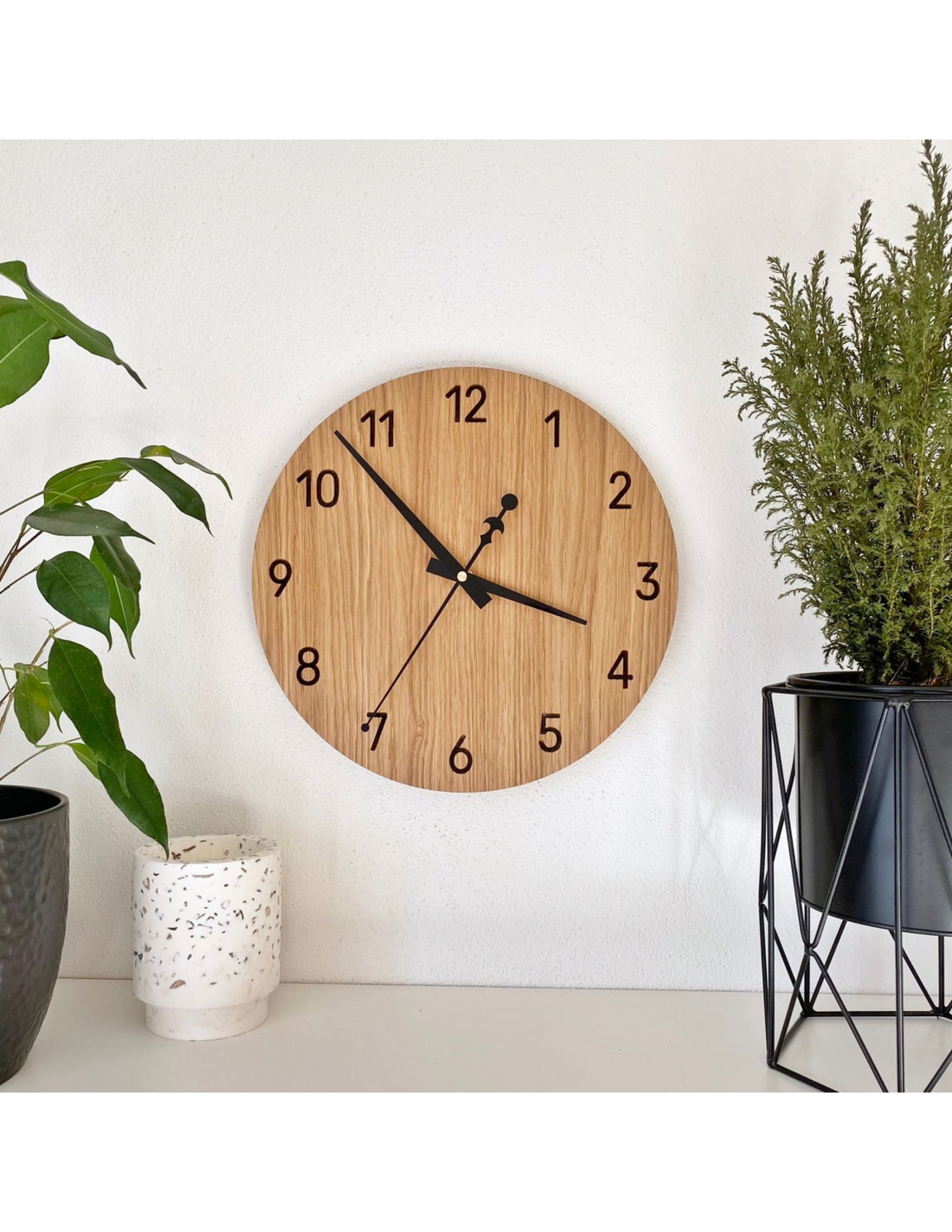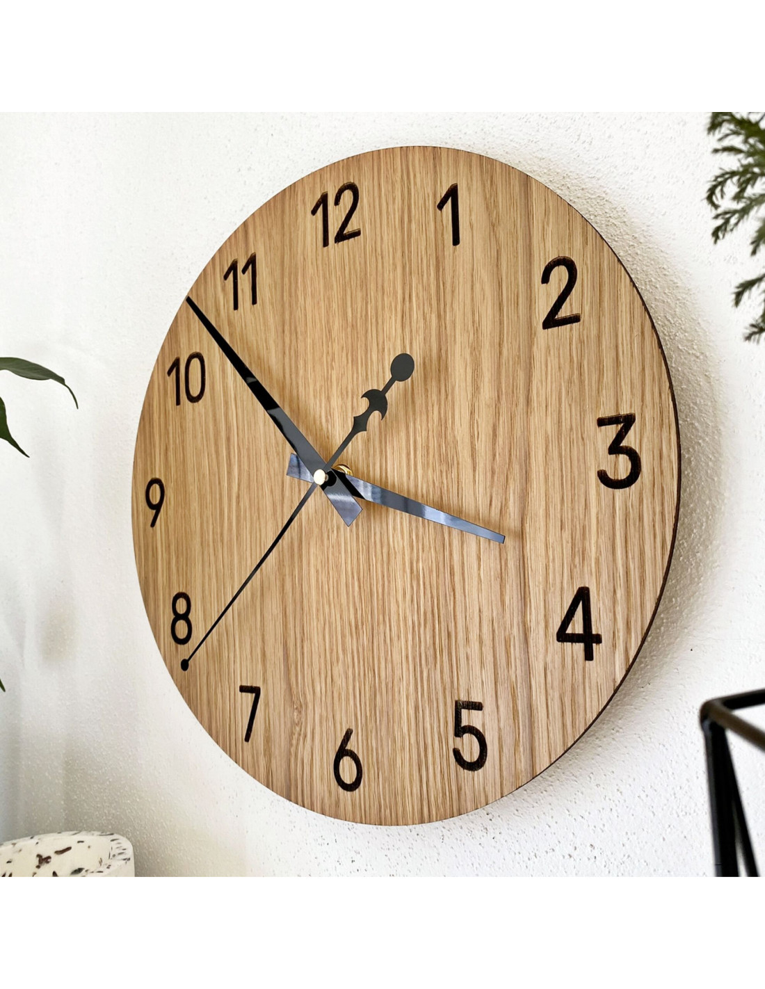 The natural beauty of oak wood combined with elegant black hands creates a subtle and modern look. The clock blends perfectly with both rustic and minimalist interiors and brings a harmonious visual element to the space.