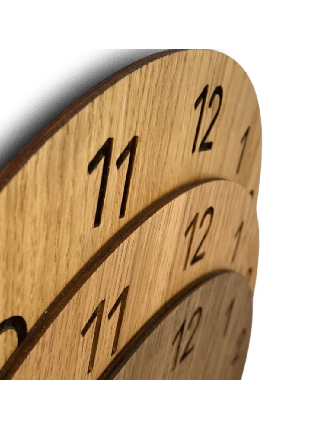 This handmade oak plywood wall clock is an authentic Slovak product that combines sustainability and timeless design. Each piece is unique thanks to the natural structure and color shades of the wood, which give the clock its own character. Production takes place exclusively in Slovakia (EU).