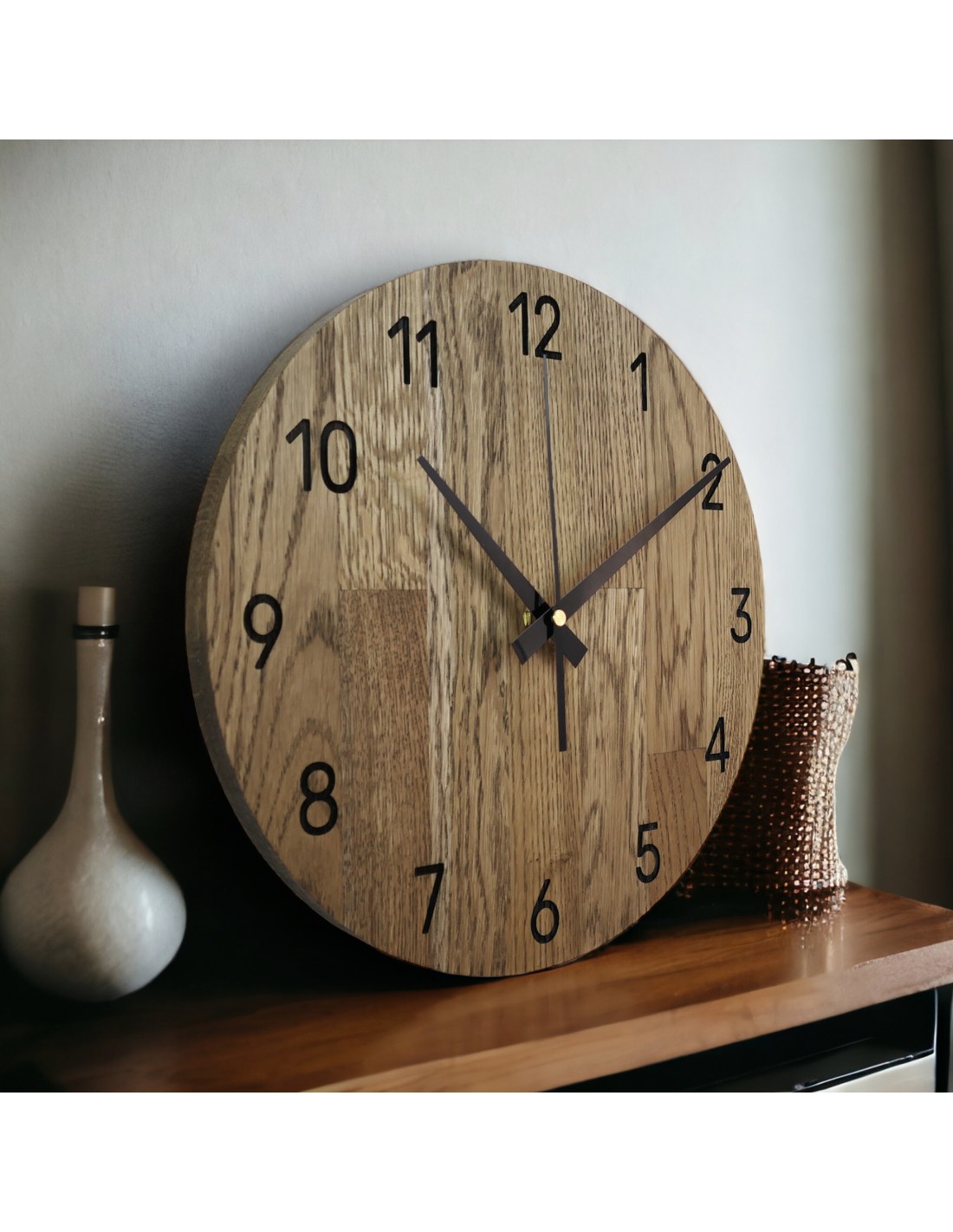 Oak wall clock, modern minimalist design, quiet operation