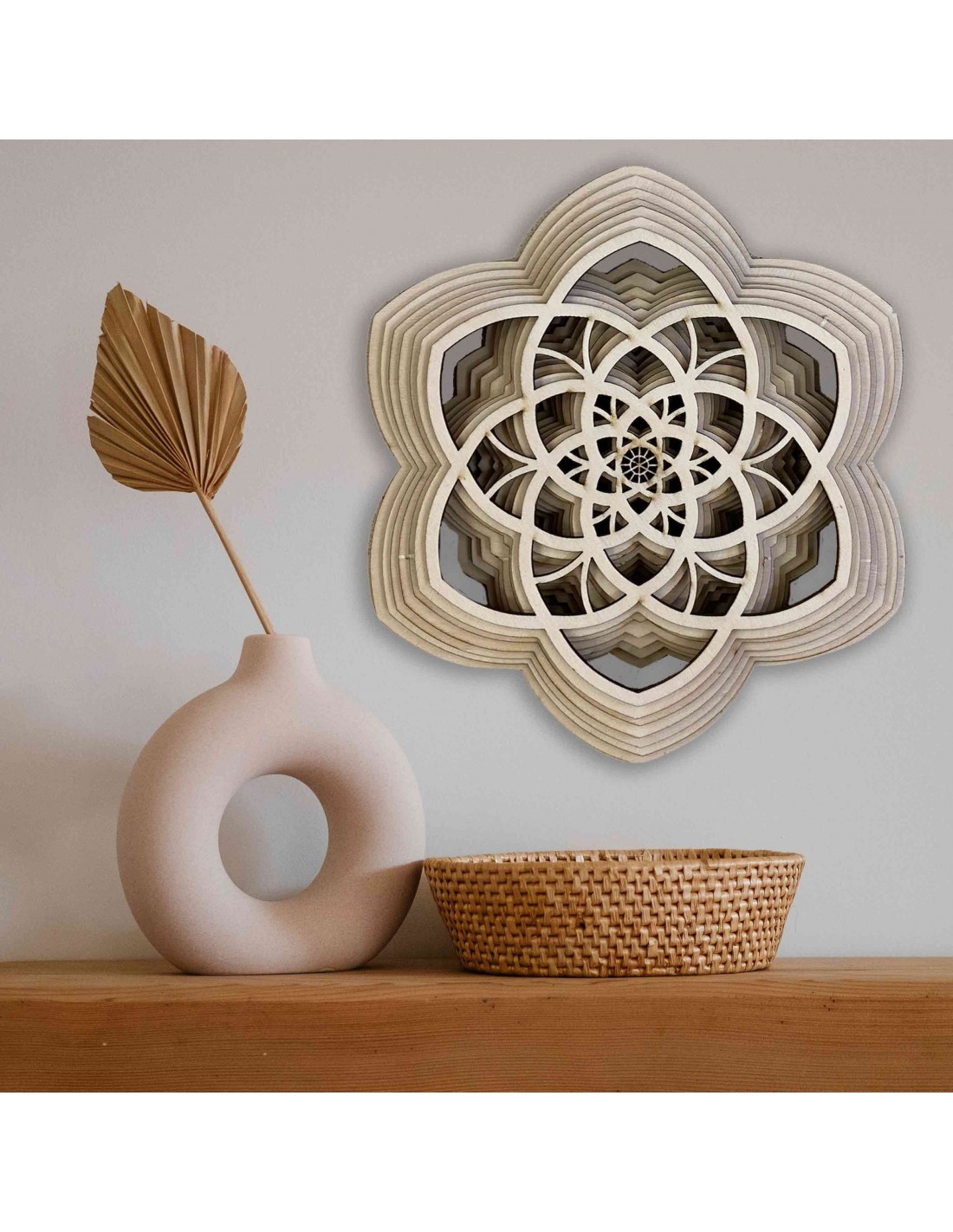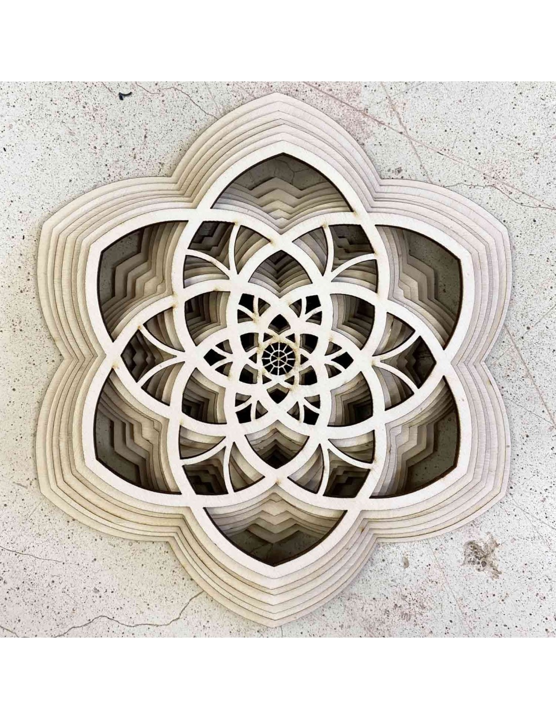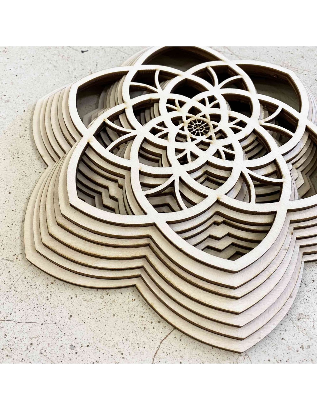 The wooden 3D mandala is created from multiple laser-cut layers.