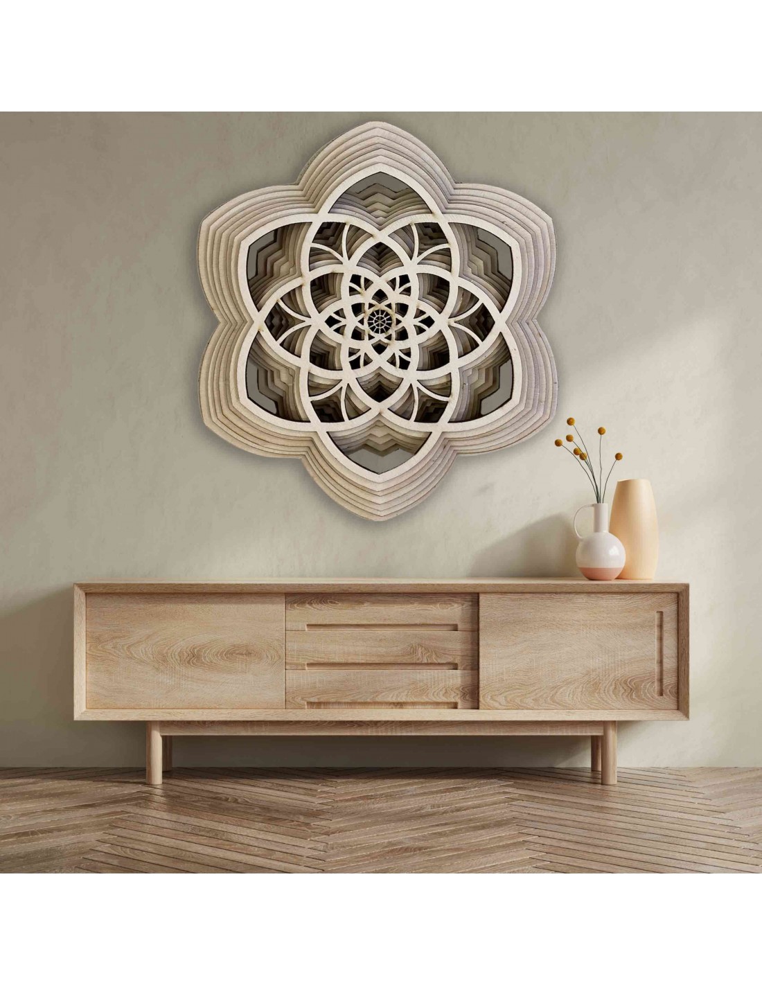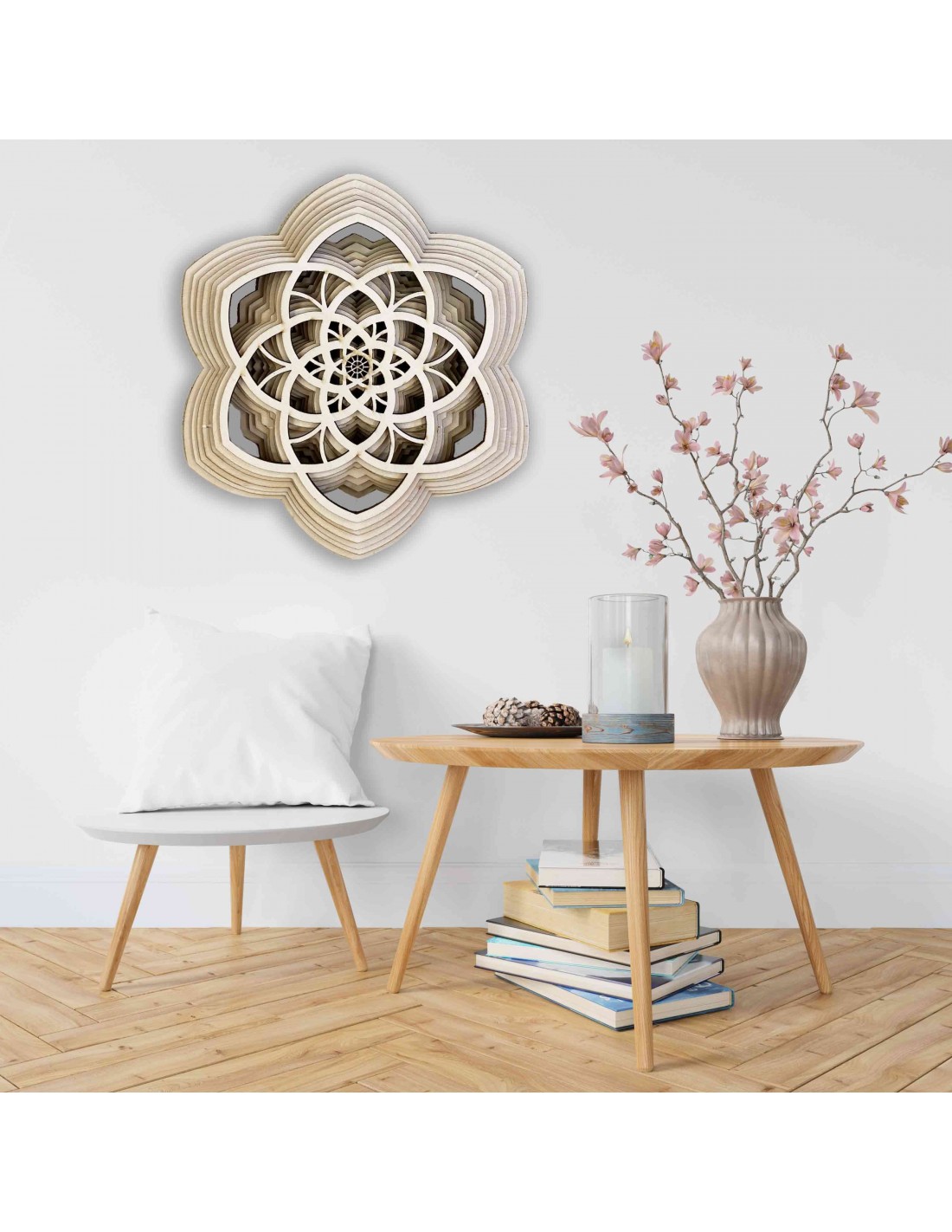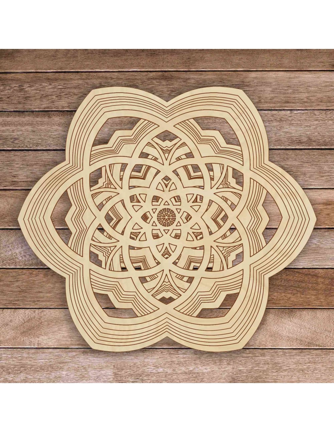 The wooden 3D mandala is created from multiple laser-cut layers.