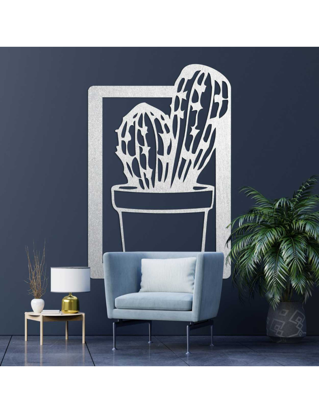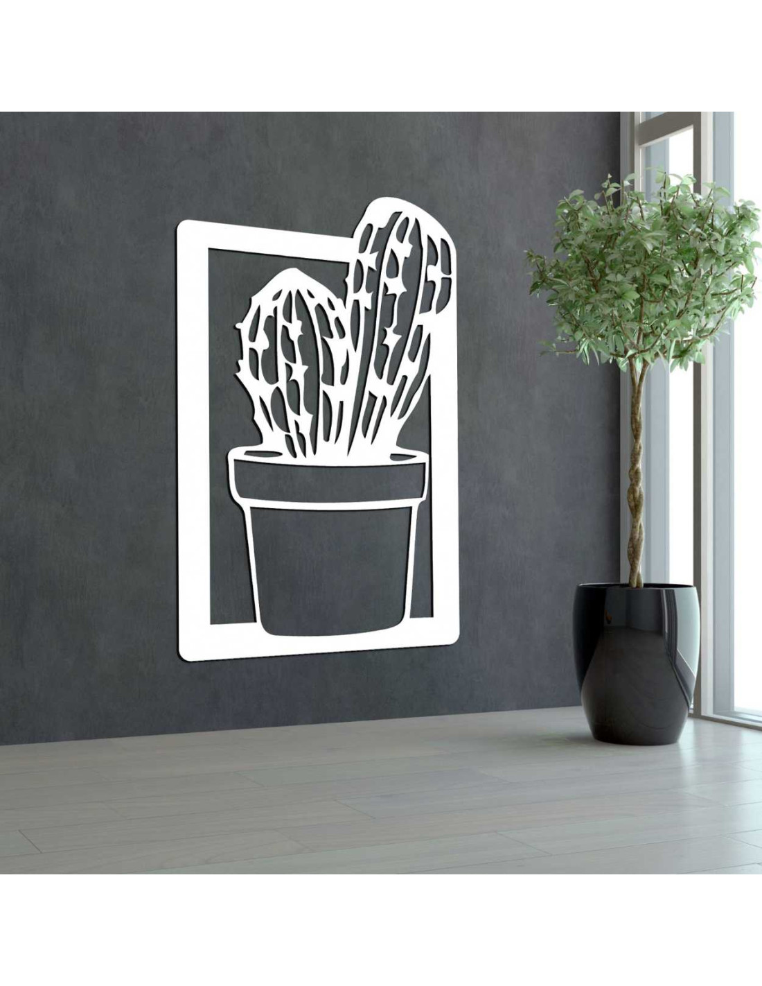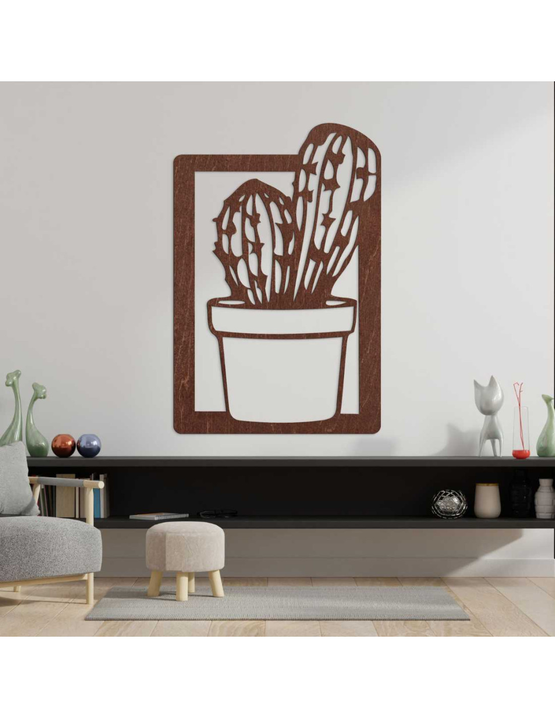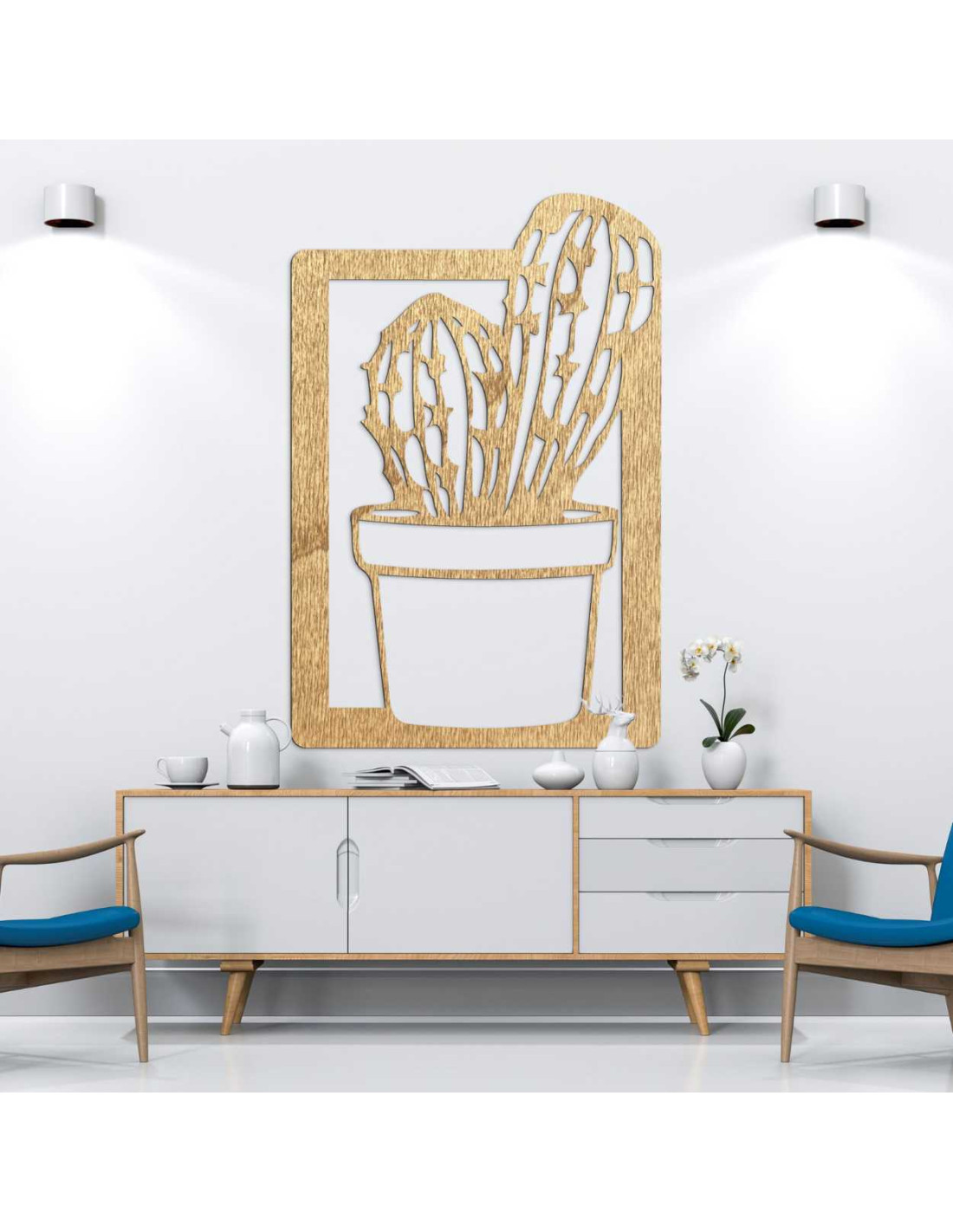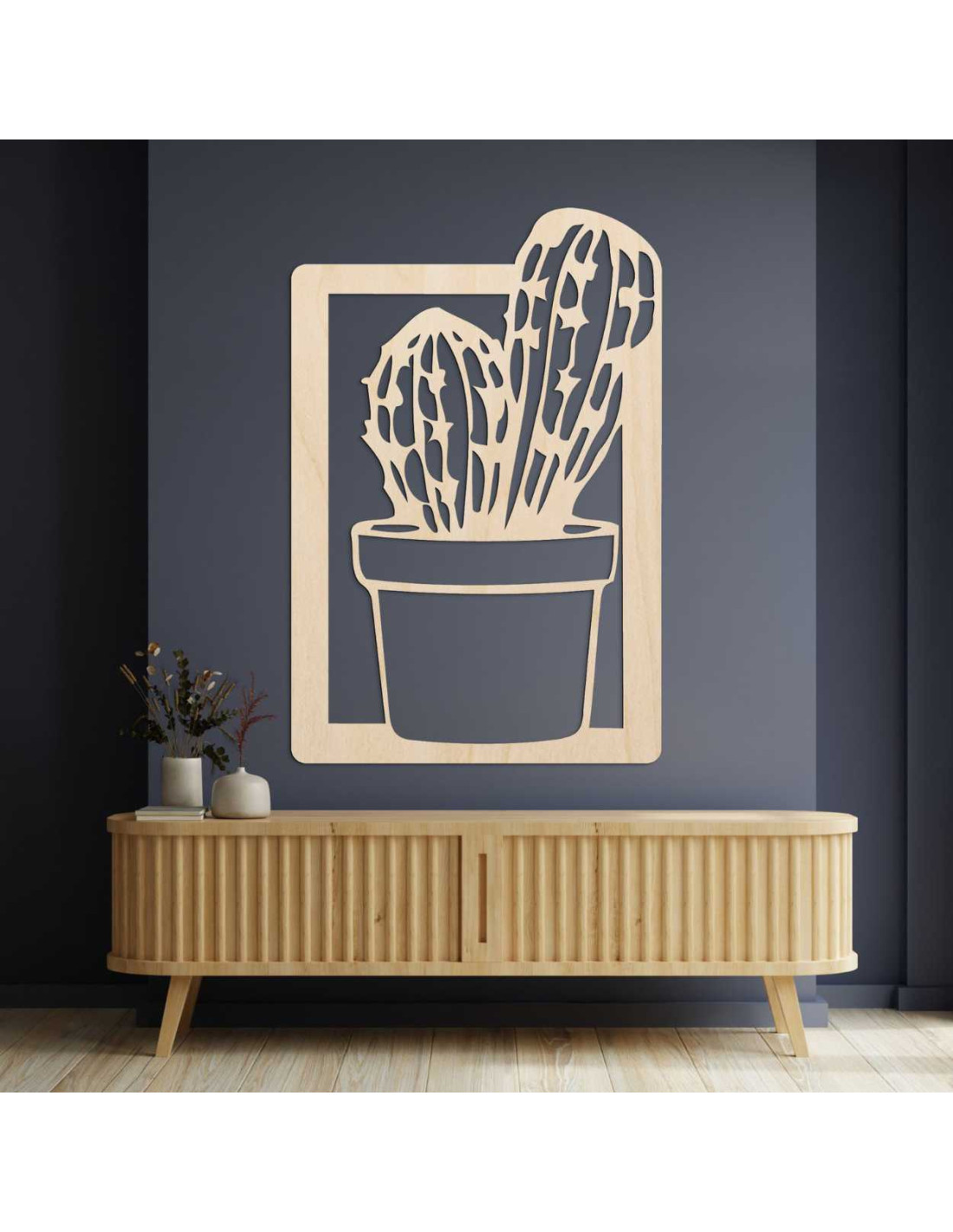 Modern wall decoration for the living room with a wooden frame and a natural cactus motif.